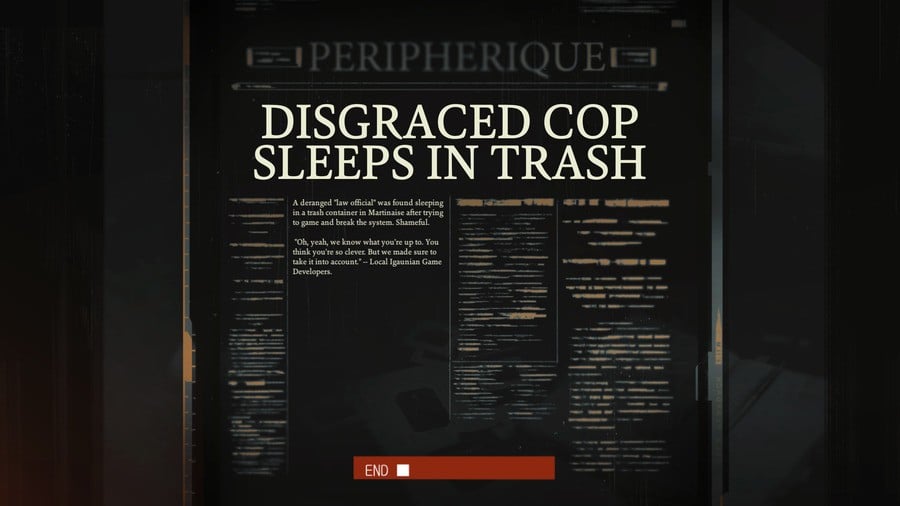 Disco Elysium is up first here because it's sort of a cheat for this kind of list, given just how many ridiculous ways there are to get a game over screen, which is represented in-game as a newspaper clipping detailing your demise and/or downfall.