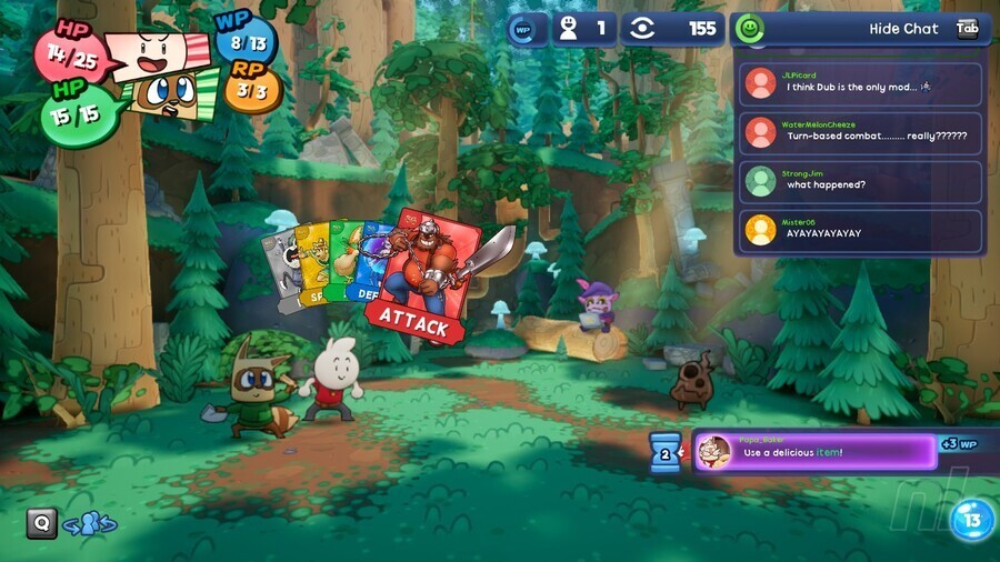 Another unique twist in this loaf takes an idea we love from Paper Mario: The Thousand-Year Door and The Origami King — the audience. Battles take place not on a stage á la TTYD, but are in fact streamed by Dub, a companion who also travels the world and saves your progress on his laptop by parking up at routers installed across the area. That means that yes, every battle is essentially a Twitch stream, which means you have an audience to keep happy.