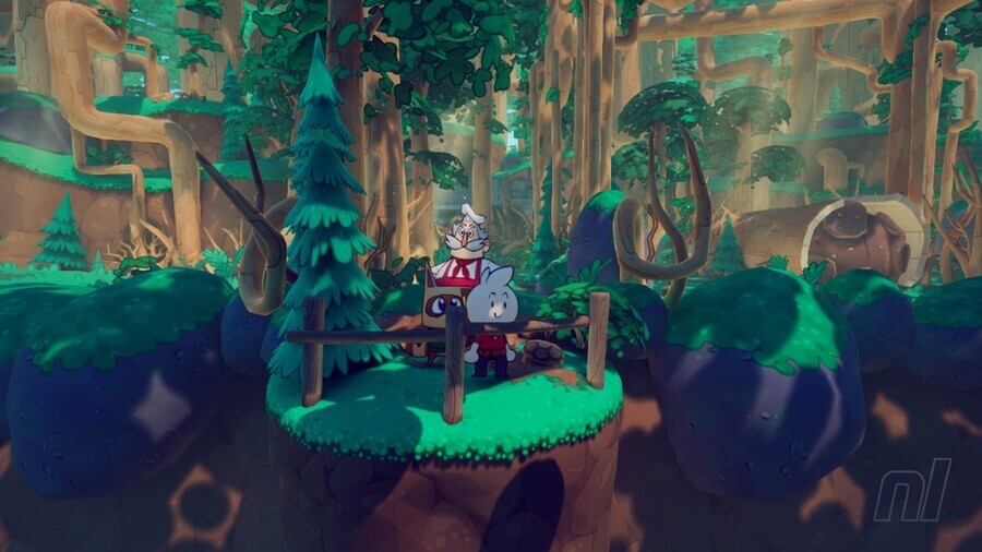 Even with its robust combat options and unique twists on the Paper Mario formula, by far our favourite thing to do in Born of Bread was simply explore. In the first three hours, we got to see the Forest of Roots, the Lapwing Village, Crystal Mines, and the city of Royal Town. Each area is vibrant and colourful, and the 3D backgrounds really help make the paper characters pop. But what surprised us was just how detailed the environments were — the trees of the forest are intricately knotted together like pipes, and you can see the light breaking through the branches and illuminating the ground.