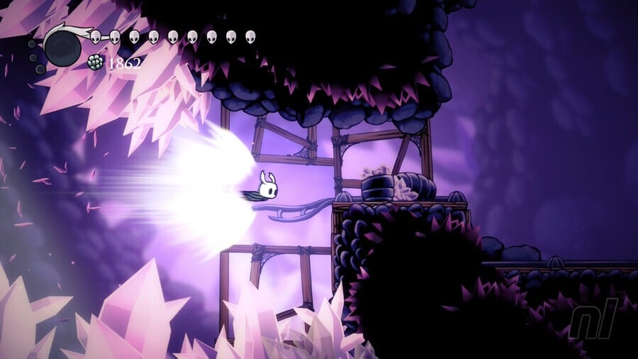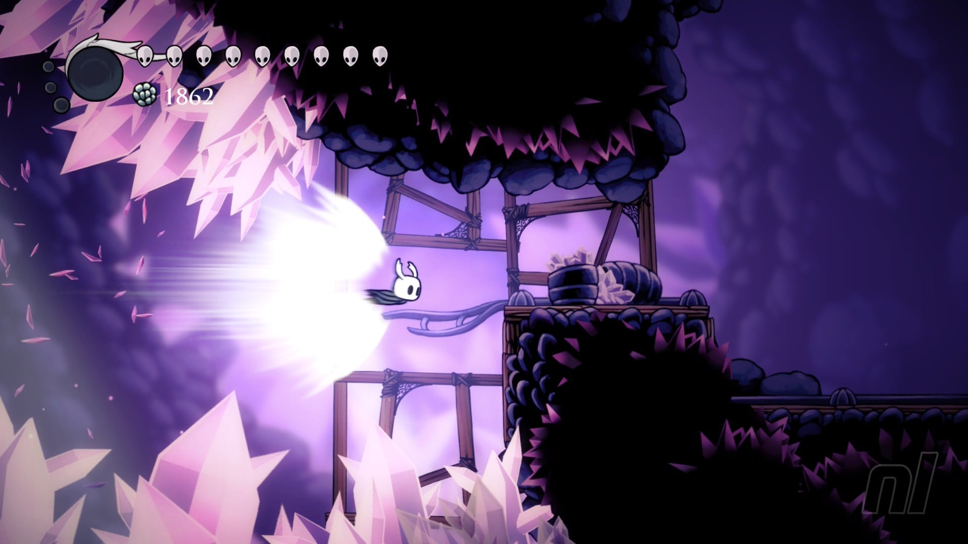 Now Crystal Peak's gems glimmer with an even more vibrant purple, contrasting even stronger with the dim lamps and the darker areas of the map. Greenpath's lush, verdant foliage feels more alive with deeper greens and shinier thorns. Even the Crossroads' dim, grey hallways appear more detailed, and when it's eventually overrun with infection, the orange puss glow feels like it's bursting out of the screen.