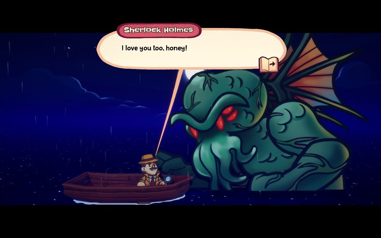 First, Flynt and his band infiltrate the forbidden section of the castle library to find their next storybook to travel to. It’s called The Shadow Over Innsbeak, a mash-up of classic Lovecraftian monsters, Sherlock Holmes mysteries, and…birds?