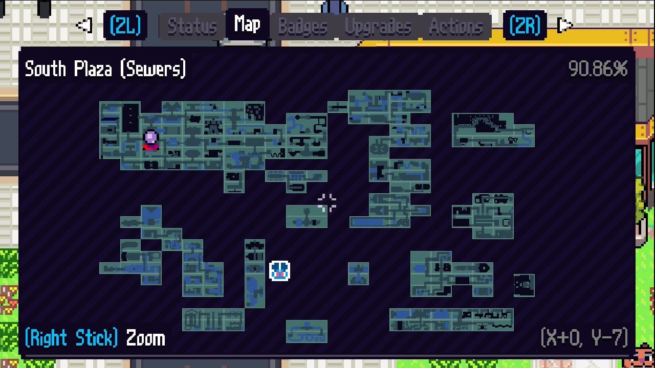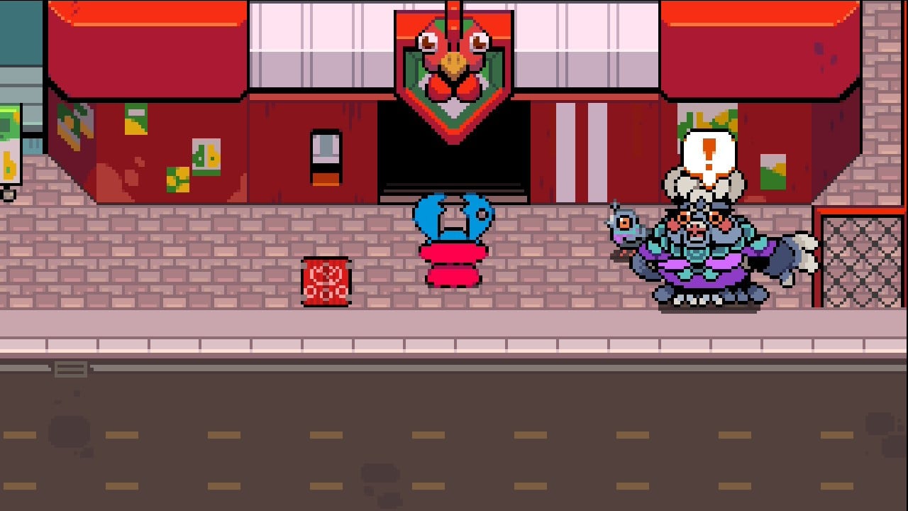 It’s just like blowing up a wall with a bomb, but Pipistrello does it with its own flair, and a dash of Metroidvania connectivity and backtracking. But with how densely packed each screen is – whether it be dissatisfied citizens or people queuing up to gorge on fast food, enemies hopping around, holes in the ground, traffic, etc. – this large city feels lived-in. This isn’t a forest and a beach and a jungle all linked together; it’s a metropolis crumbling under the weight of corporate competition.