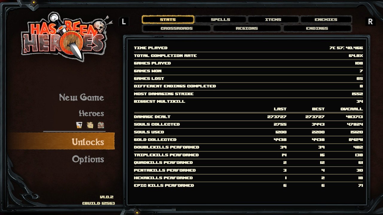Unlocked four characters so far - somewhere between 20-25 hours. Very satisfying when a run goes your way and you are mad OP for the final few battles. Really like it and when to get to the end but MK8 and Puyo Tetris areally taking priority now.