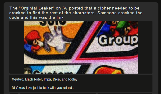 Well I'm still hyped for game. It helps if you believe the leak is false. Also we still have one last character reveal trailer which could make or break this leak! Even if the revealed character is shulk it could still break the leak, but only if his moves and artwork are different, of course. What I'm trying to say is to take this with a grain of salt and think positively.
