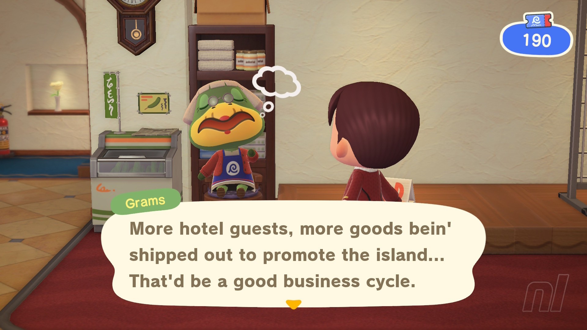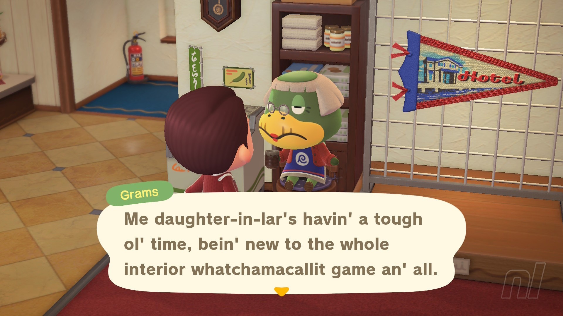 Speak to Grams to see the full catalog of exclusive items, which will grow with more items (including retro Nintendo consoles ) through decorating more rooms and increasing its "island brand recognition".