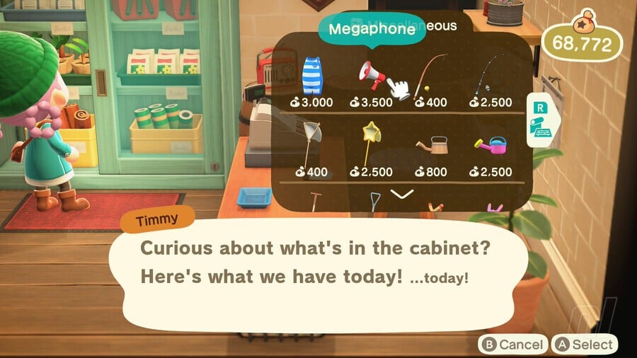 The Megaphone can be bought from Nook's Cranny for 3,500 Bells, inside the cabinet where all the other tools are stored. We have the upgraded store, so we're not sure if it's available earlier. And unlike other tools, the Megaphone won't break, so you only ever need to buy one.