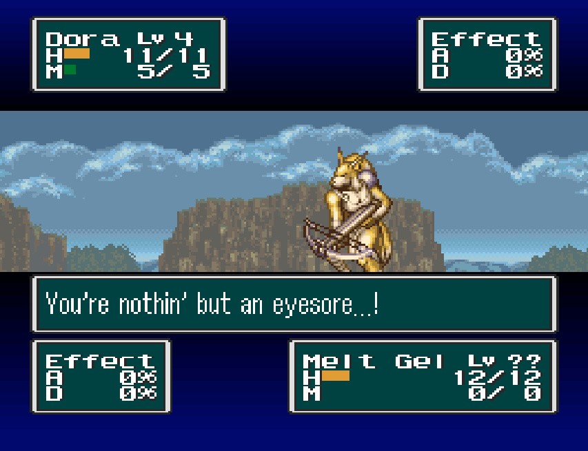 @Purgatorium FFMQ is competent. It works as it's supposed to outside of some weird bugs. It has some nice ideas (interacting with the maps with your weapons and jumping, the soundtrack, the mildly parodic elements of the plot), but its conception was really cynical from Square's side. "Those silly Americans are too stupid to properly enjoy our games, so we'll try and make a beginner's RPG so they finally 'get it'," even though the big problem at the time was that D&D-style games were ridiculed as being "for nerds" which kept them from finding a wide audience until FF7 finally broke that stigma. It doesn't help that it was also the only FF game to come to Europe for years.