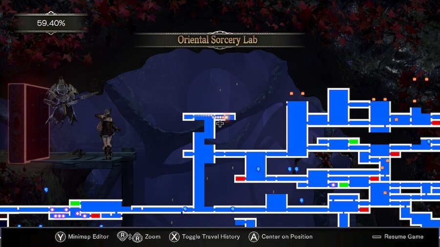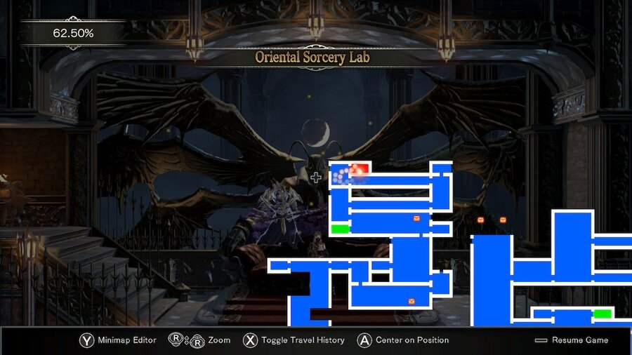 In the next room, there will be some red pillars that act as teleporters. Use these to climb upwards into the upper reaches of the Oriental Sorcery Lab. When you’ve reached where you need to go, you should be here on the map (see below):