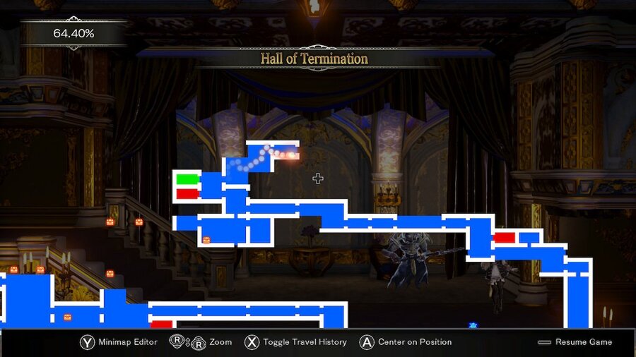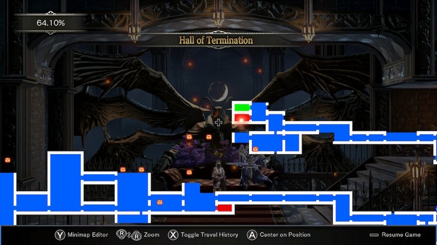 Once in the Hall of Termination, head up the stairs and then up the stairs above those. Attack the wall to get an MP Max Up. From here, jump onto the chandeliers and use those to traverse across. Go through the exit in the bottom left corner. Continue forward into the next room and traverse across the floor. Continue up to the upper left corner. In this next room, go through the middle left exit to find a stained glass portal room.