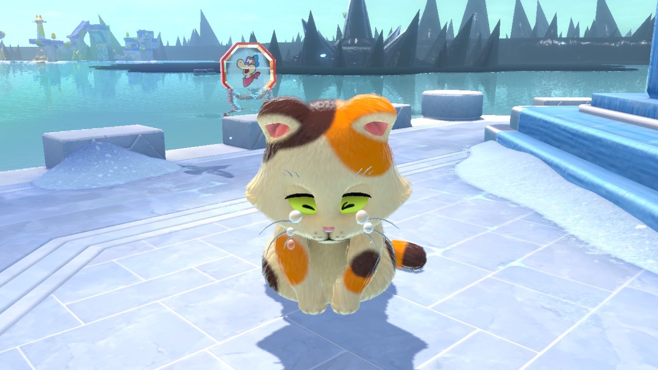 The third lost kitten is the hardest to rescue. It's located at the Crisp Castle Climb archway, and you've got to get it all the way back to the Ruins Giga Bell island – and the moment you fall into water, the kitten's position is reset. Thankfully, right next to the Crisp Castle Climb archway there's a floating island which rises up from the sea and moves slowly towards Trickity Tower, where you can alight safely. Make sure you navigate the submerged platforms carefully and don't fall into the water.
