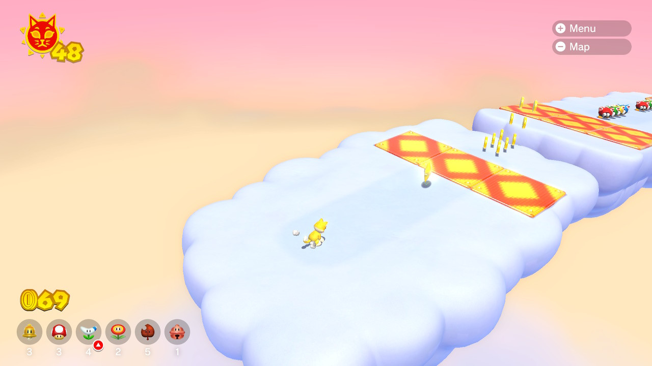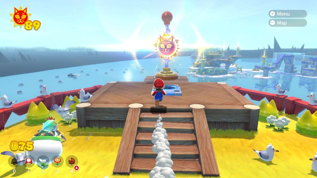 Next to the Ruins Giga Bell island you'll spot an island with three trees on it and some enemies walking around on the beach. There should be a smiling cloud at the top of the tallest tree. Shimmy up and jump into the cloud and you'll find yourself transported to a small course in the clouds. Collect the Star and take out all of the enemies – when you do, a Cat Shine will appear at the end. Once this is collected, simply leap through the gold rings to return to the land below.