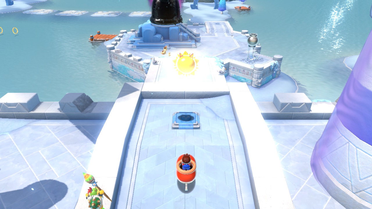 Make your way to the island which sits below the rather daunting Slipstake Slope, and take the pipe which will fire you onto the slope. The objective here is to slide down to the bottom, where you'll find the Cat Shine and the lighthouse. You can use the ice skates to do this, but be careful of the enemies and spikes.
