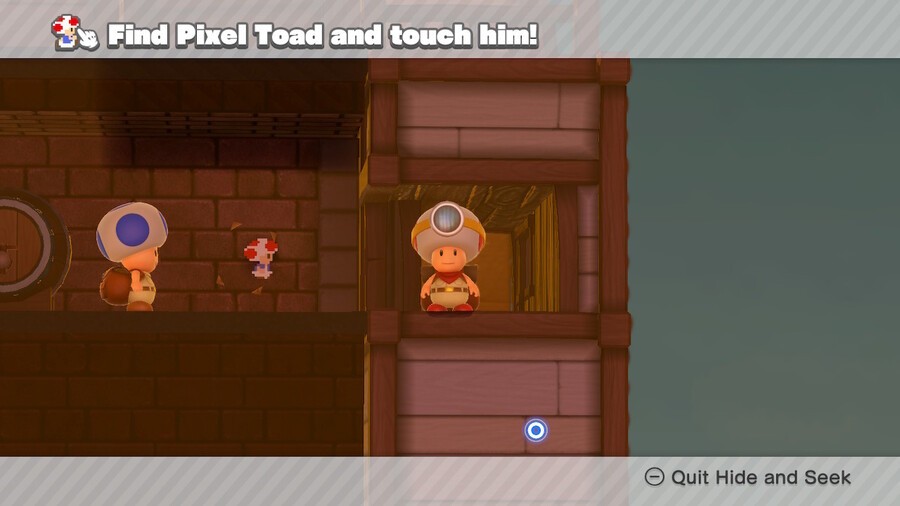 Pixel Toad is hiding behind the poster next to the blue toad.