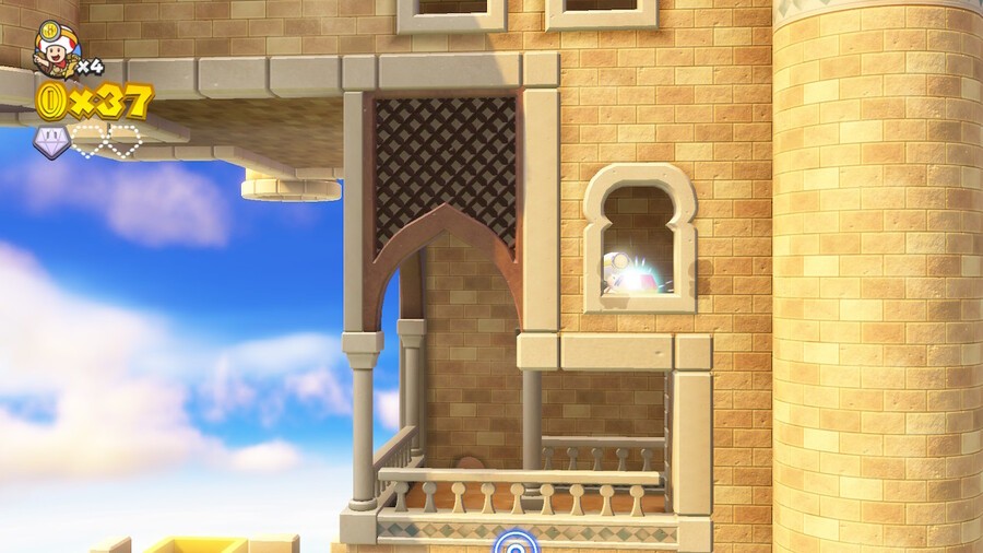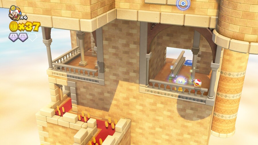 Make your way down these platforms by stepping on the power buttons with each toad. Once you've stepped on two power buttons, you should see a small door on the left side path. Head through it and tilt the camera 90 degrees anti-clockwise, revealing a gem. Grab it and move on with your life.
