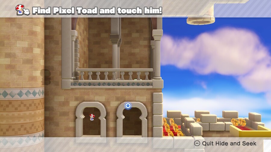You pretty much have to complete this level to find Pixel Toad. Get to the bottom of the platform section right after you beat the first maze and look at the left side of the palace (the left of the initial camera position) and you'll see Pixel Toad leaping back and forth across a window. Bless him.