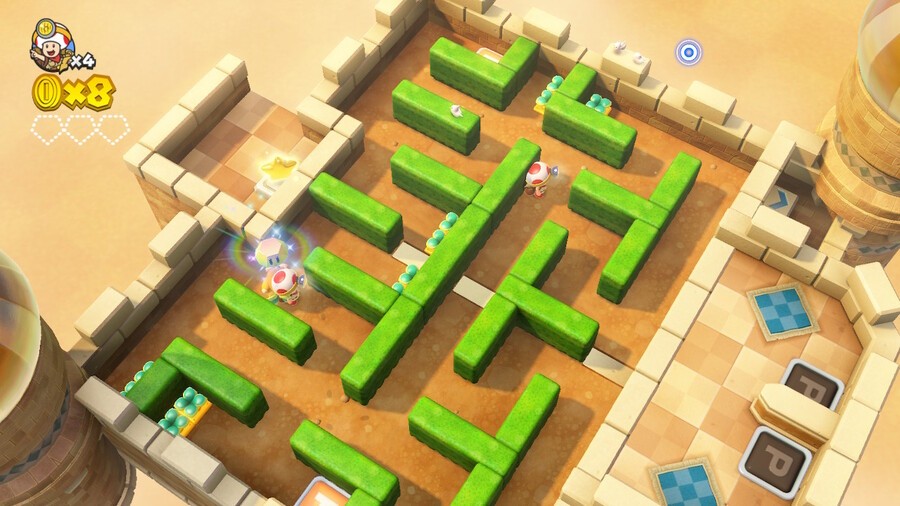 Once again, get your toads on each power button (this one's easier if you stick a toad on the lower one first). This creates a division in the maze, splitting up the toads. Head to the back of the arena and drop down.