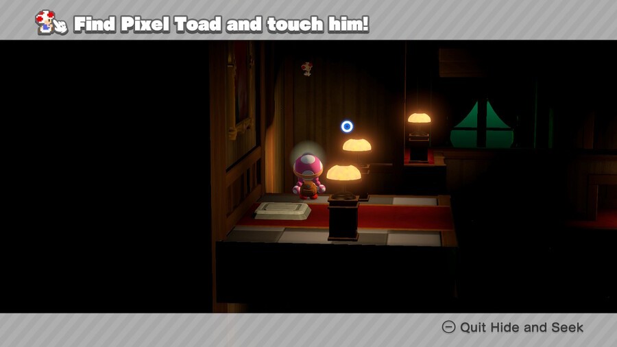 Get to the end of the level and point your torch at the right wall. You'll see Pixel Toad chilling out there.