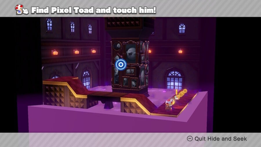 Pixel Toad is hiding behind one of the ghostly picture frames on the central tower.