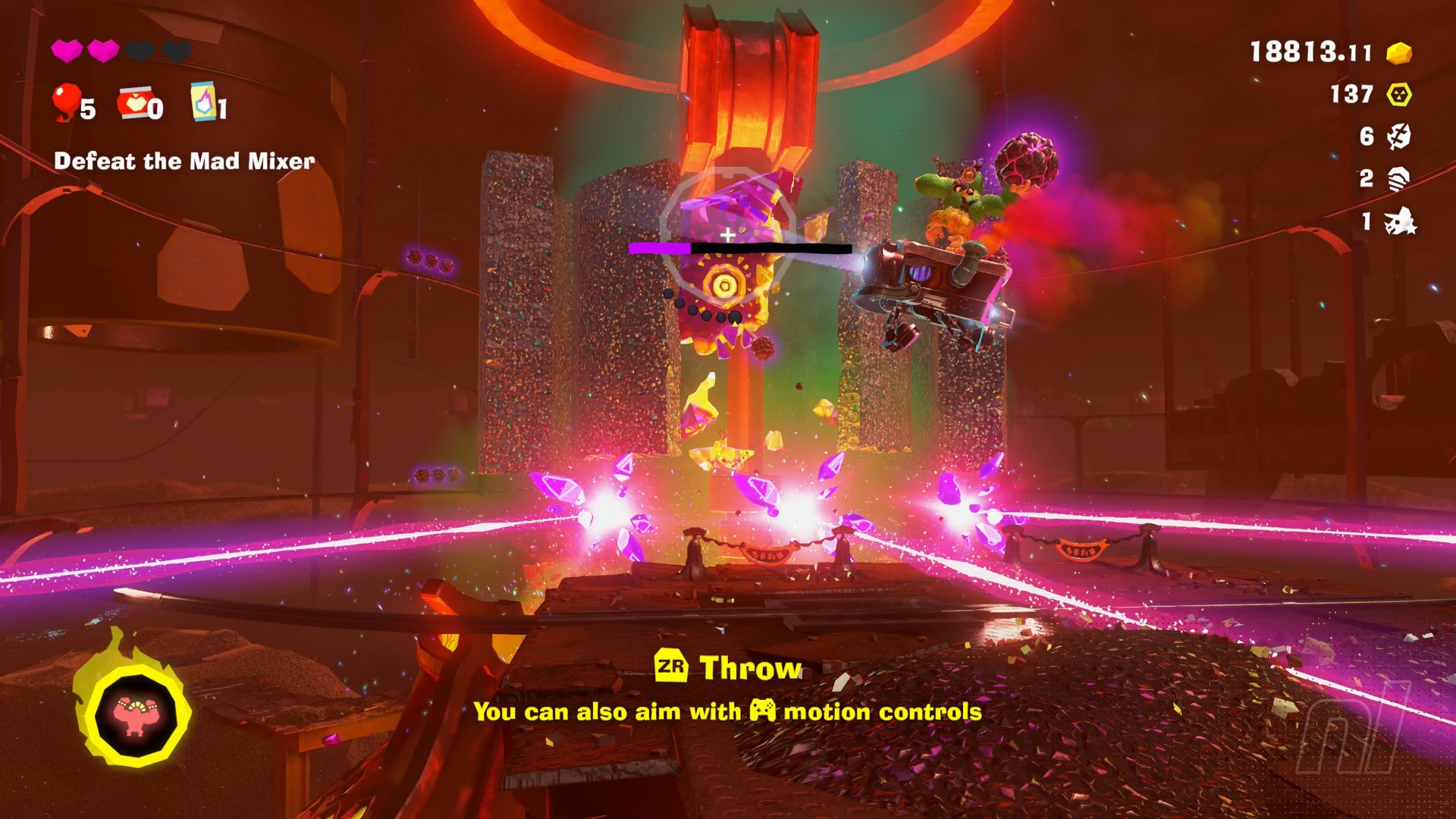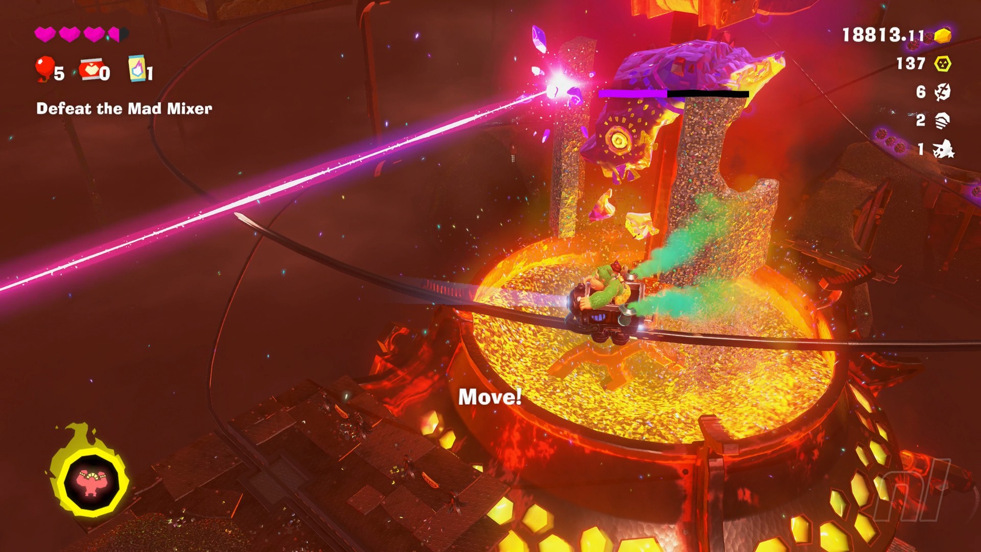 The mine cart track takes a sharp incline at points, providing you the perfect opportunity to rain down attacks on Mad Mixer from above. At this height advantage, you don't really need to worry about avoiding the sand shields, just aim for the centre and get throwing!