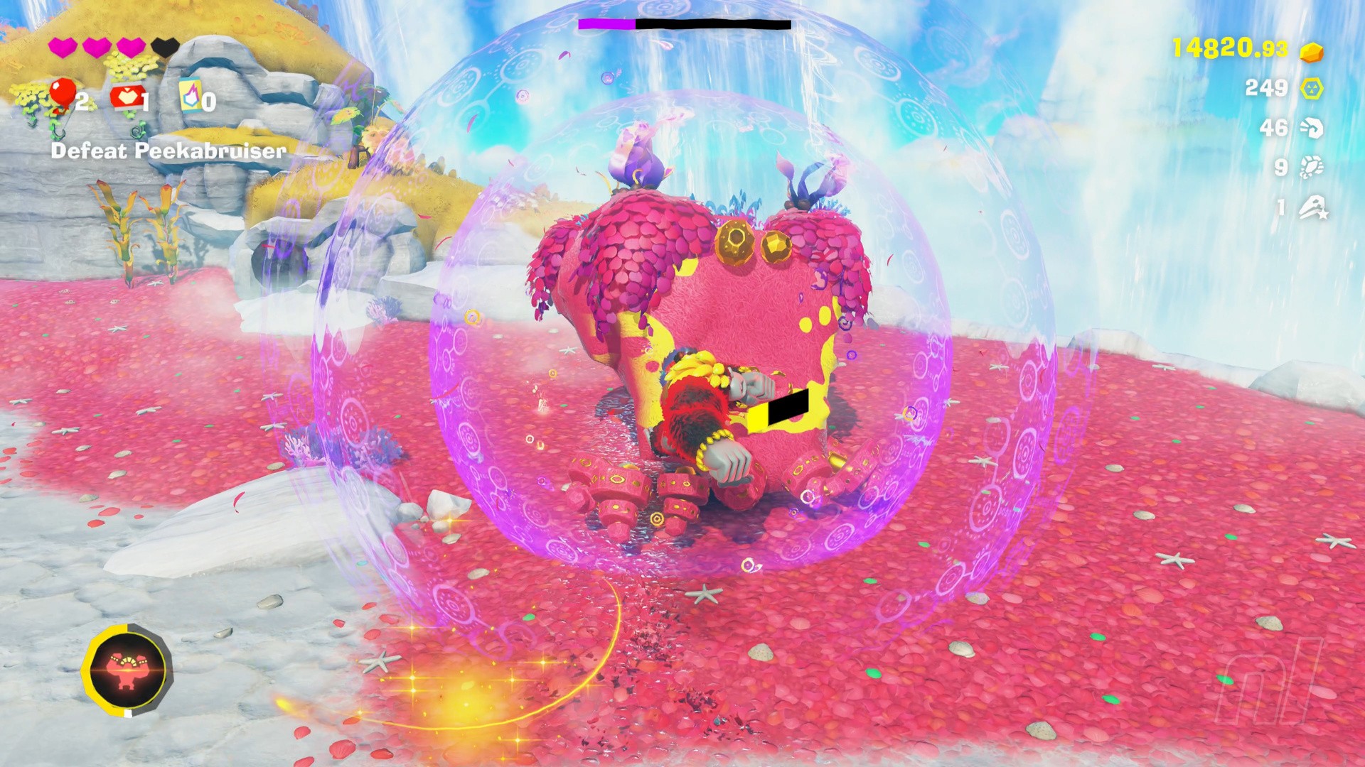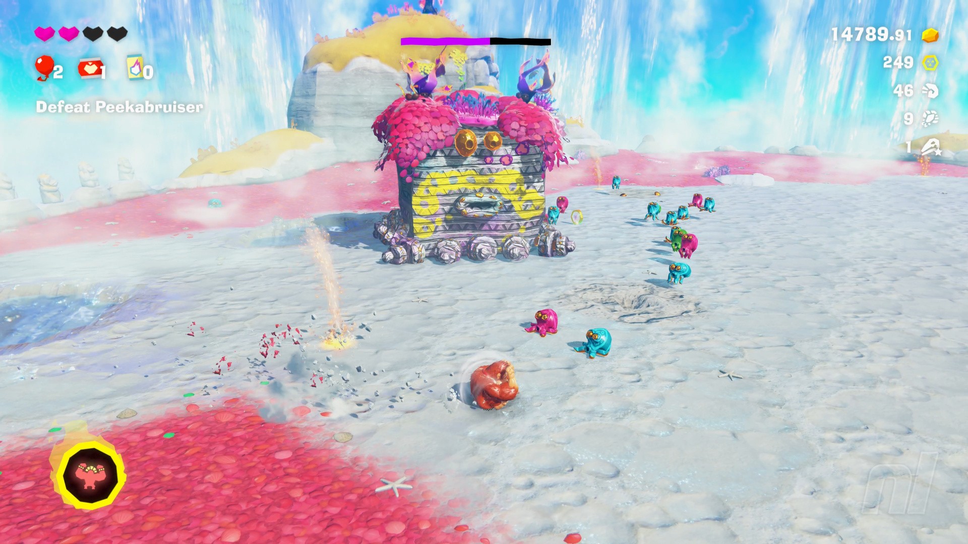Peekabruiser will adopt either a soft pink or a concrete exterior — you'll need to use Kong Bananza (or Rock Smash) to break through the latter, but normal DK will be able to deal with the softer option just fine. Whatever state it's in, keep smashing 'Y' to break through the outer body and head for the core.