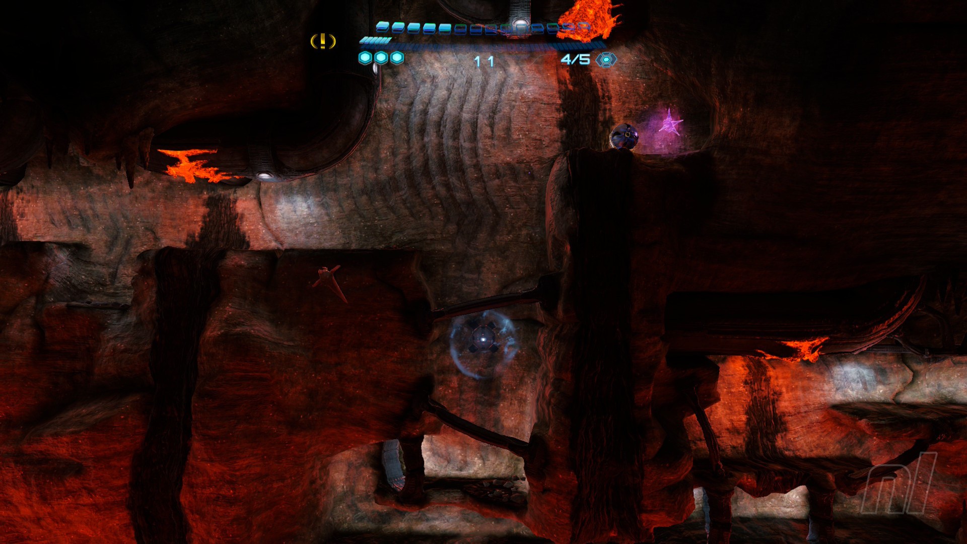 Get off Vi-O-La when you come to a small bit of land. Fire a missile at the morph ball tunnel, then roll on through. Make your way around the short maze, waiting for any lava falling from above to stop. You'll notice a Power Bomb Expansion up above, but you can't get it thanks to the lava.