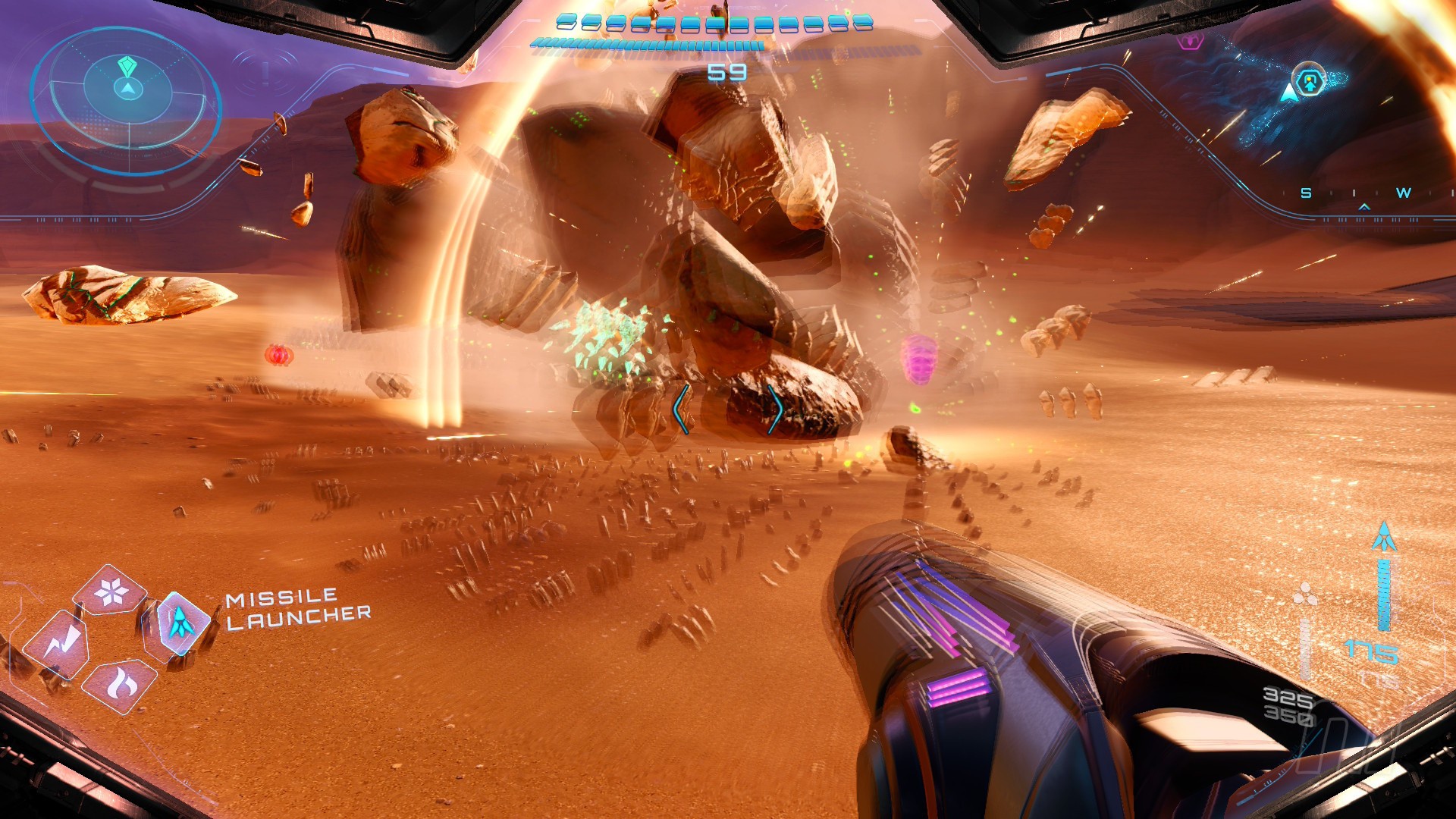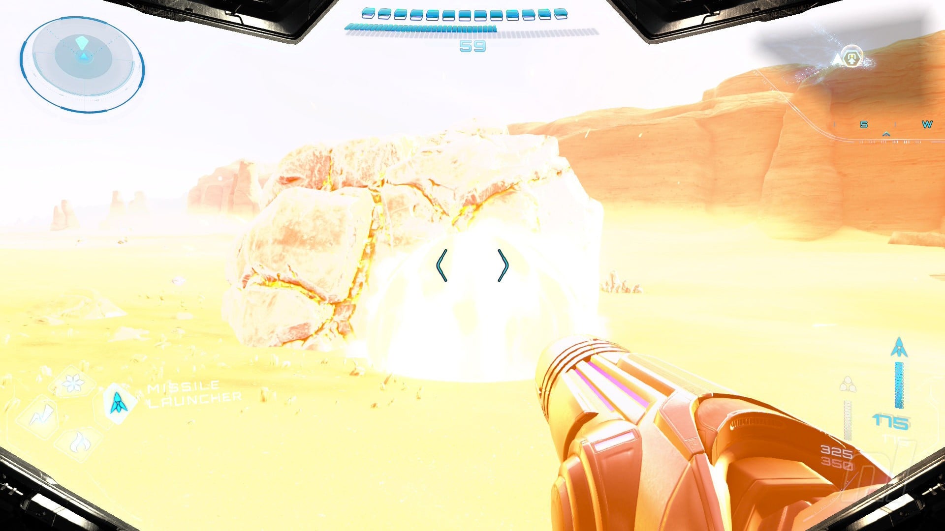 Speaking of which, some select clusters out in Sol Valley will also contain a large, dark boulder. These can only be destroyed with a Power Bomb, so jump off Vi-O-La, drop into morph ball mode, and lay a Power Bomb next to the boulder to destroy it. Samus will absorb the crystals.