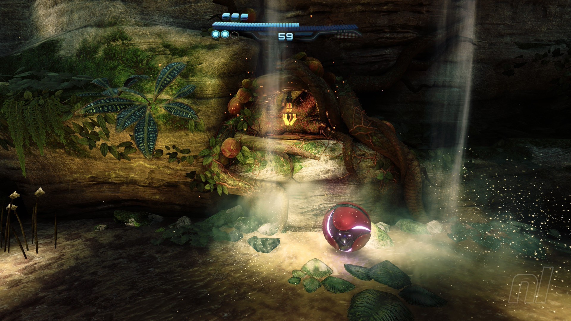 To reach the upper floor, you'll need to drop into morph ball mode and fool one of the machines into thinking you're the wheel of a Vi-O-La. The machine will pick you up and place you onto the upper floor.