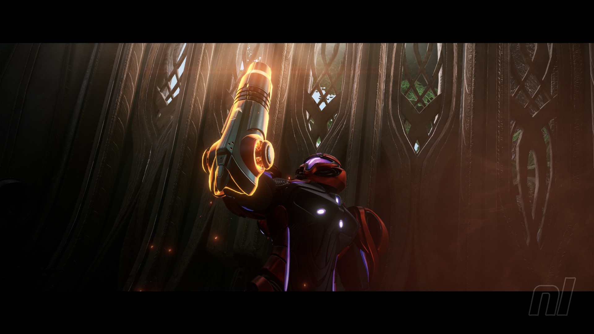 Shooting a switch on the wall will cause the platforms to rise slightly and allow for access to the upper floor, but they'll almost immediately fall back down. So, head onto the platform right next to the upper floor, then use your Control Beam to guide your shot to the switch. Immediately jump from the platform after it rises up.