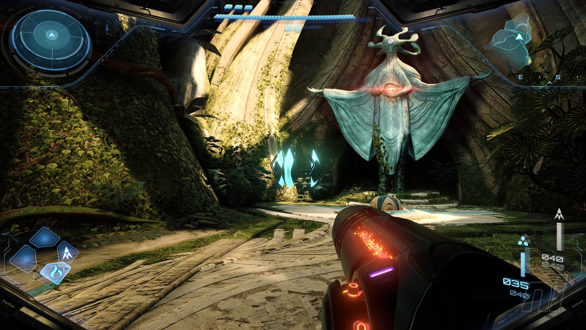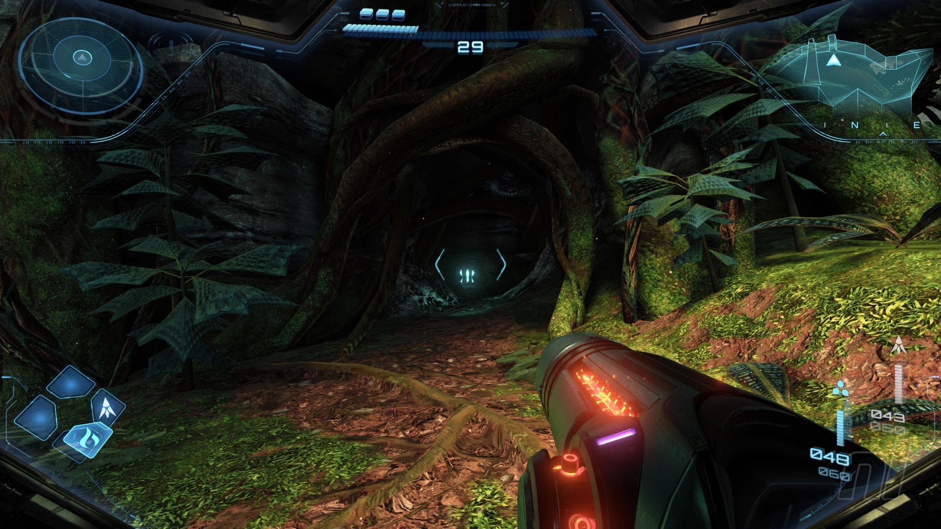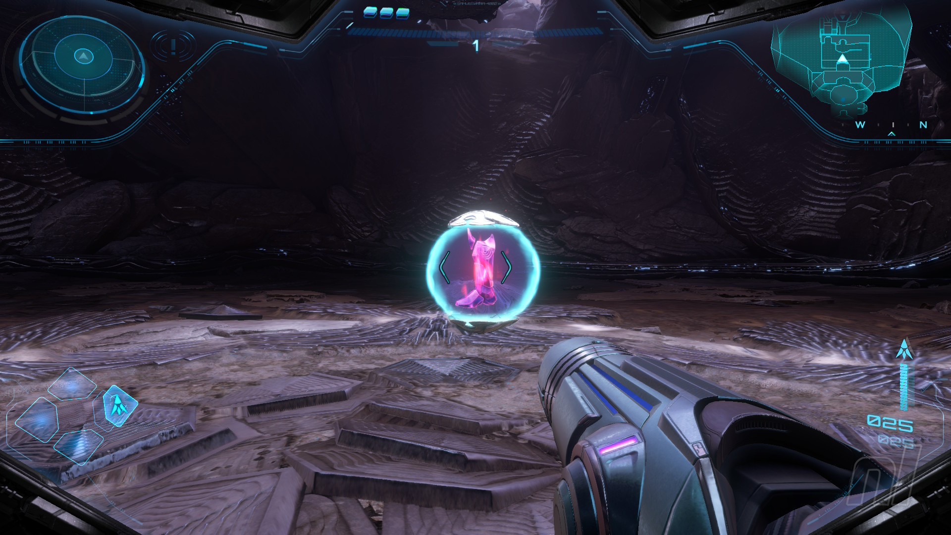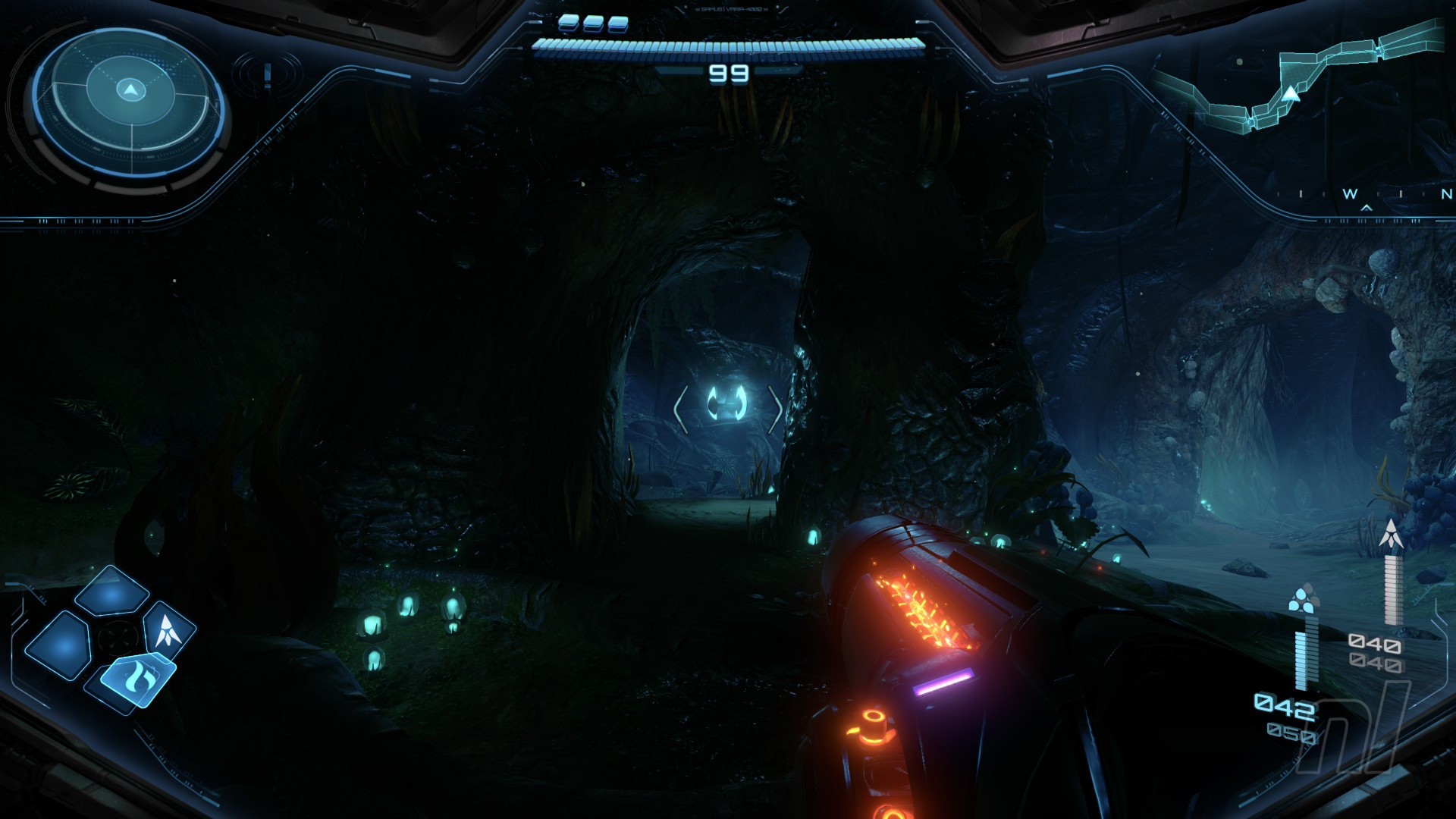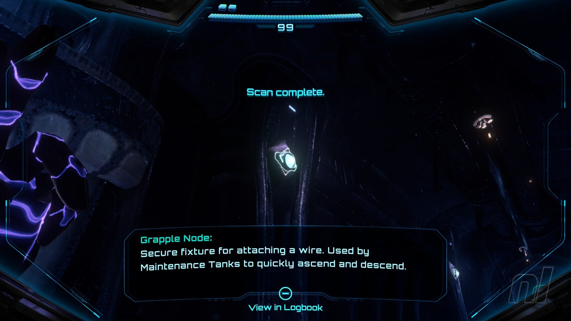 You'll see three lights on the walls; two on the left and one on the right. These are Grapple Nodes, and we'll be coming back later to use these. For now, scan the closest one.