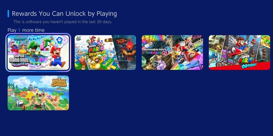 | November 2023 | Animal Crossing (November birthdays - from 7th November), Super Mario Bros. Wonder, WarioWare: Move It!, Super Mario RPG, Holiday-themed |