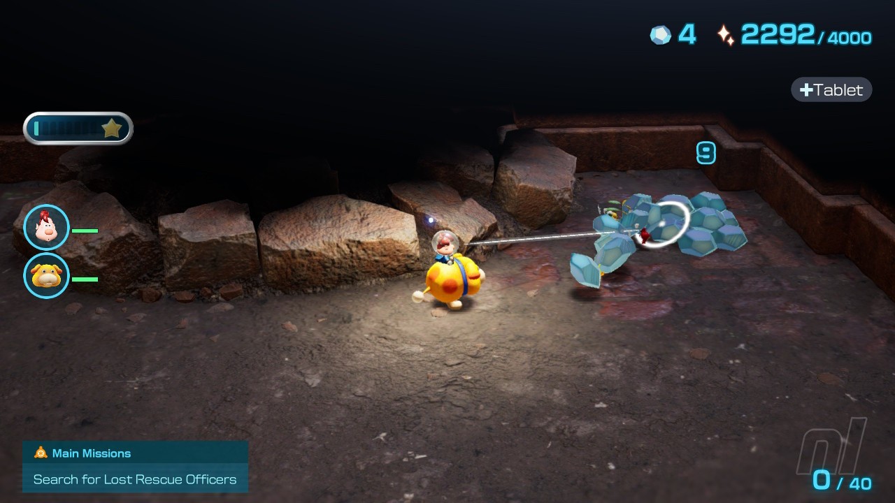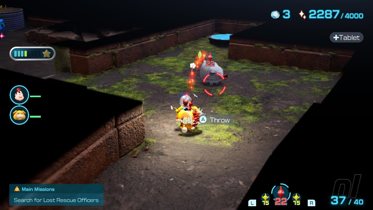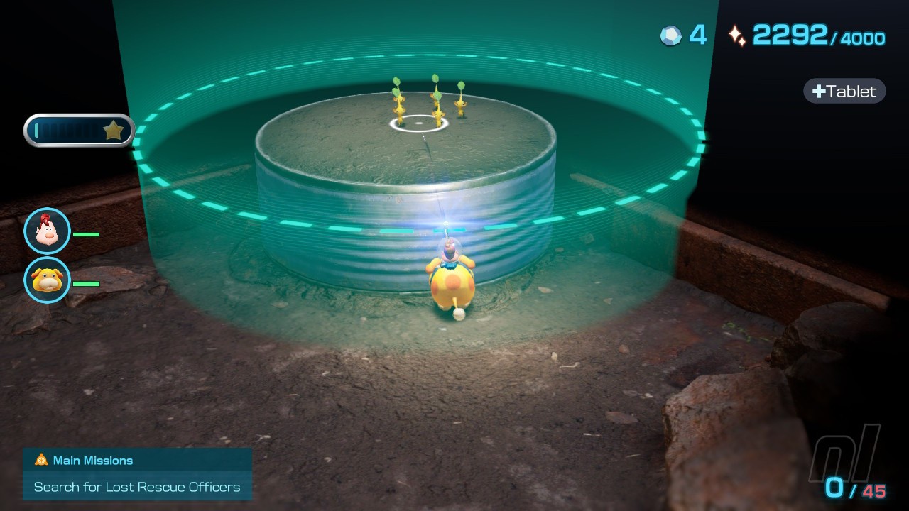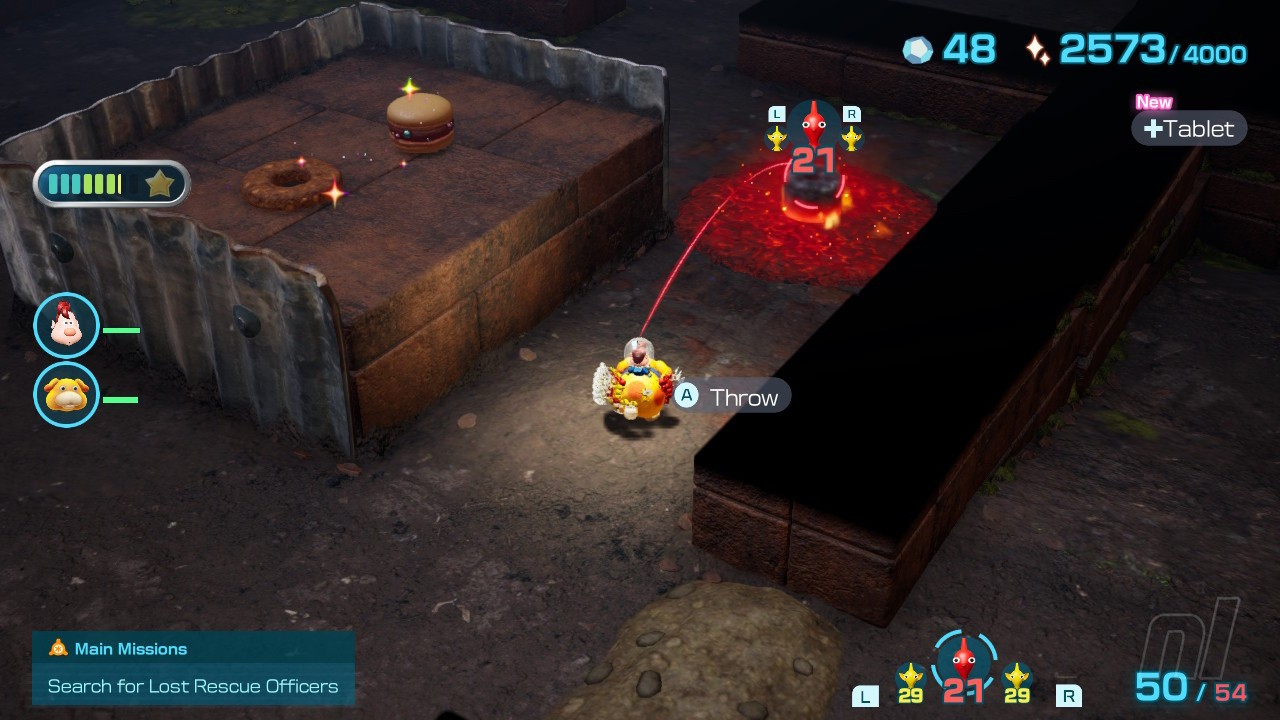 Now head towards the electric fence and make sure to defeat the flying enemy and grab the pile of raw materials. Once the fence has been taken out, you'll need to extinguish another flaming area of floor before flinging a few yellow Pikmin up to rescue the next castaway from their perch. Congratulations, you've found Dingo, the rescue corps solo mission extraordinaire.