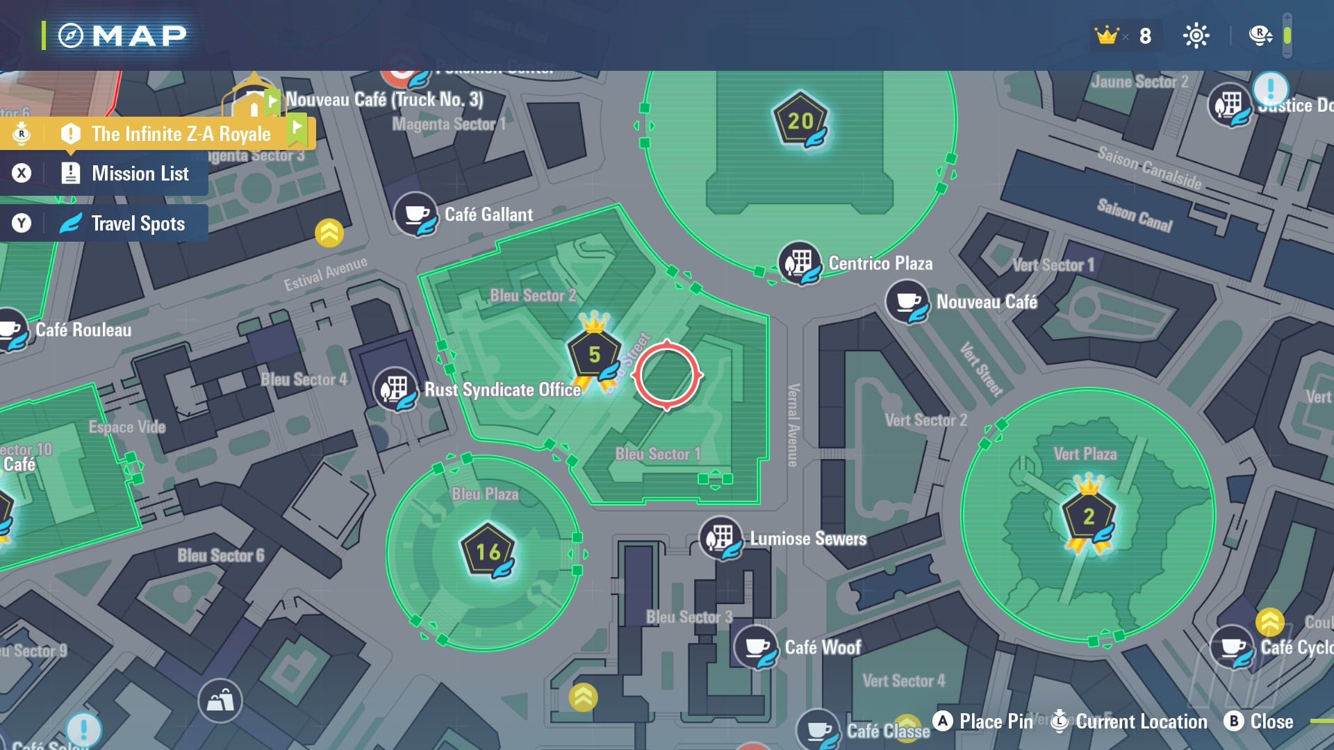 Wild Zone 5 is pretty hard to miss, as it eats up all of Bleu Sector 1 and 2. It's just southwest of Centrico Plaza and Prism Tower and right next to Café Gallant and one street west of Nouveau Café.