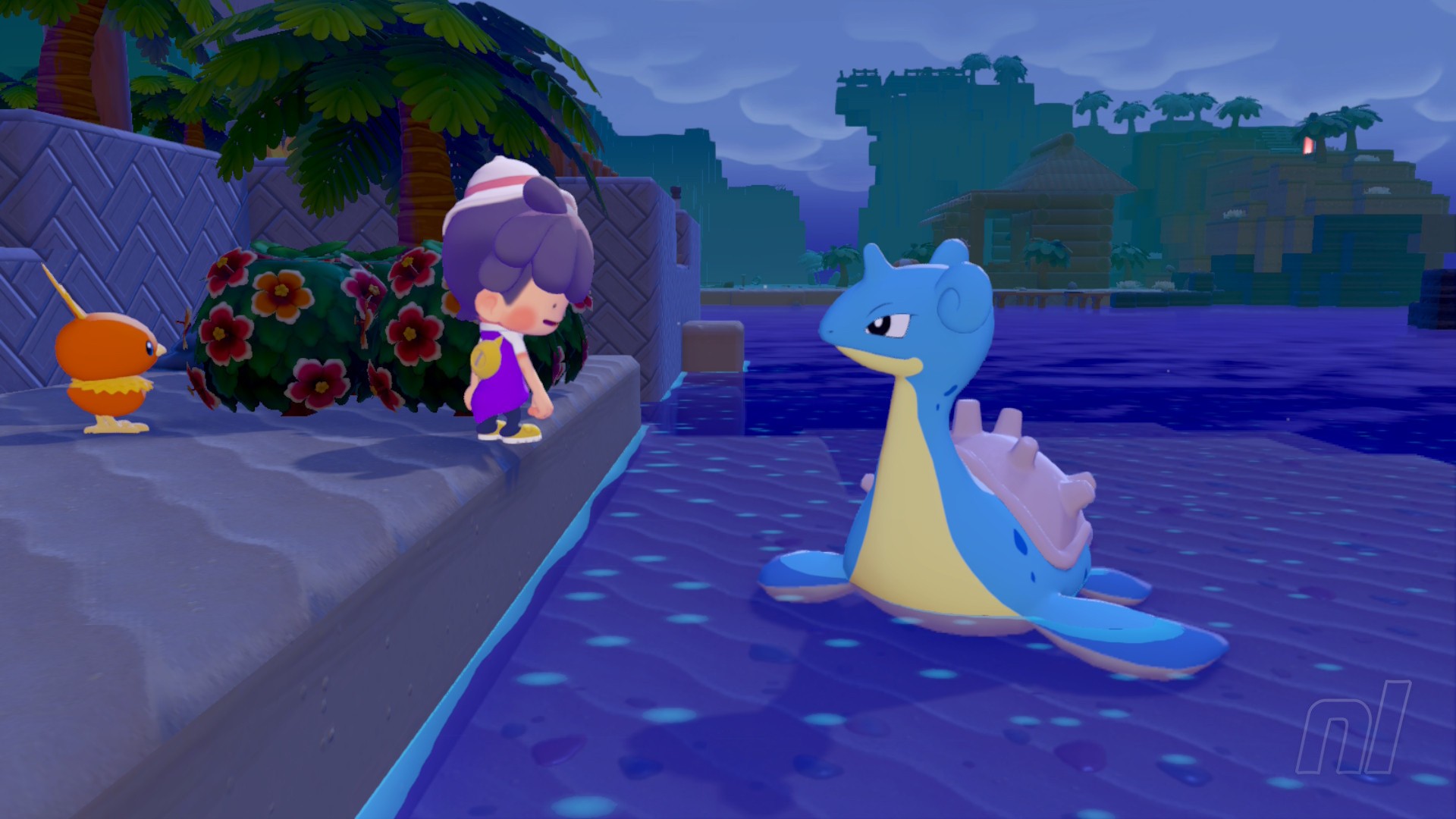 Professor Tangrowth has a solution, so you'll want to build the Tropical Seaside habitat with 4 Hedges in front of a Palm Tree next to some water. You'll soon meet Lapras, who wants the beach cleaned up, With Piplup on your side, that should be pretty easy, so clean up all of the surrounding mud.