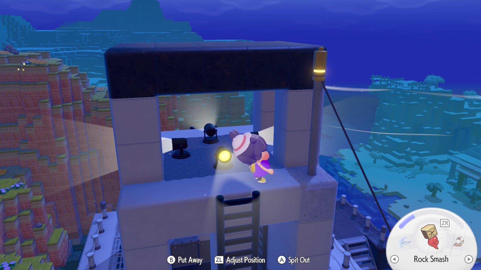 Once Peakychu has made his way to the cave, speak to her and she'll give you the recipe for a Shell Lamp. Go ahead and make it and stick it on the wall of the cave. Bring a Pokémon with the Generate Specialty to light it up.
