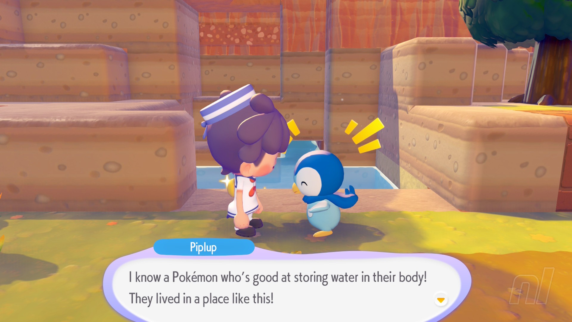 Throughout Piplup's questline, you'll learn how to Surf and how Waterwheels work, two essential skills and tips. After you've done both of these things, the little penguin will have another quest for you: make a Waterfall. You'll do this at the small little pool close to then entrance of the beach, past all of the houses.
