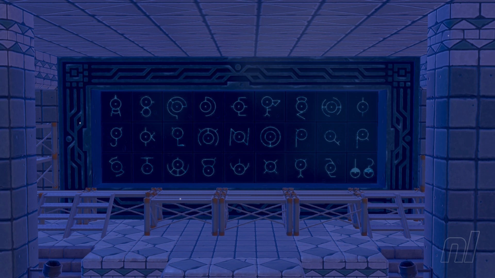 If you're a long-time series fan, then you'll recognise the etchings on the wall as Unown, who were introduced during Generation II. These symbols are the key to figuring out the puzzle solution.