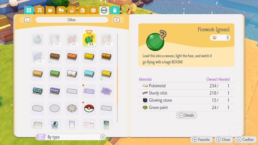 For the Fireworks, you'll want a Pokémon with the Crush Specialty to make you some Paint. Here's everything you want to make them: