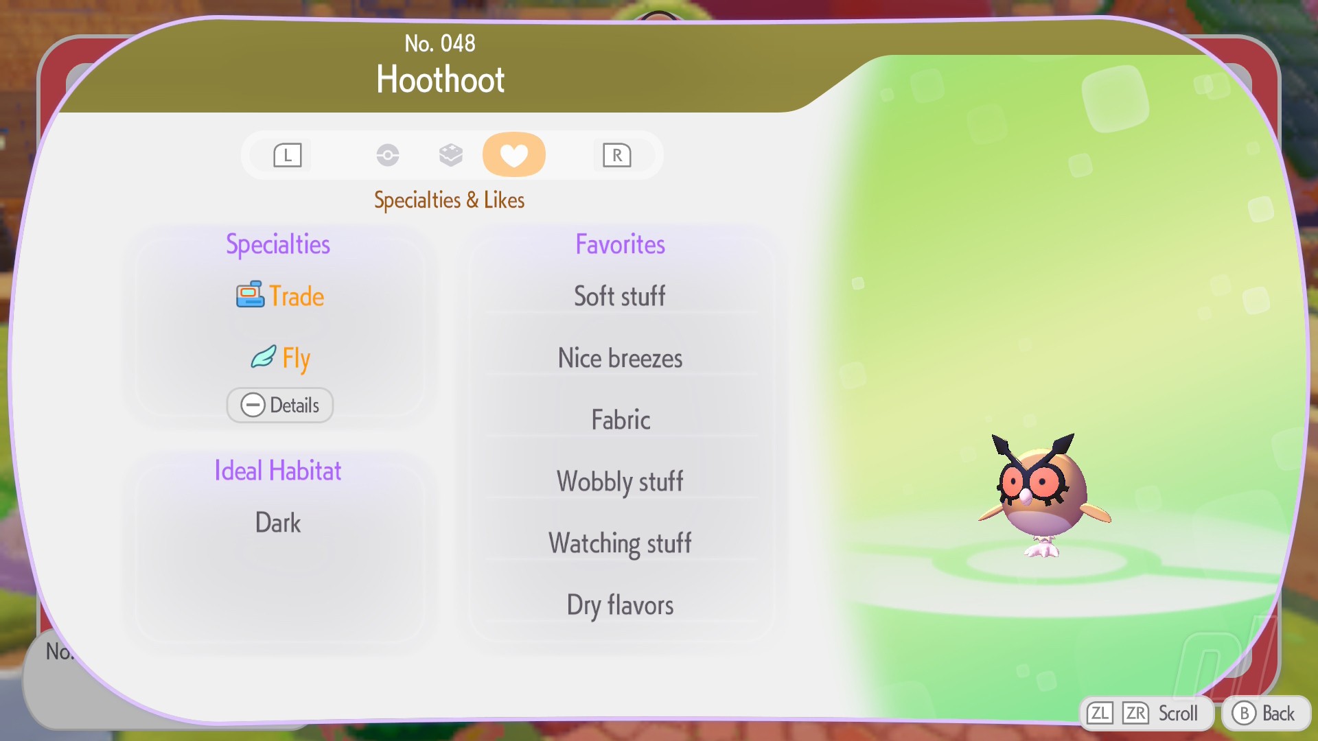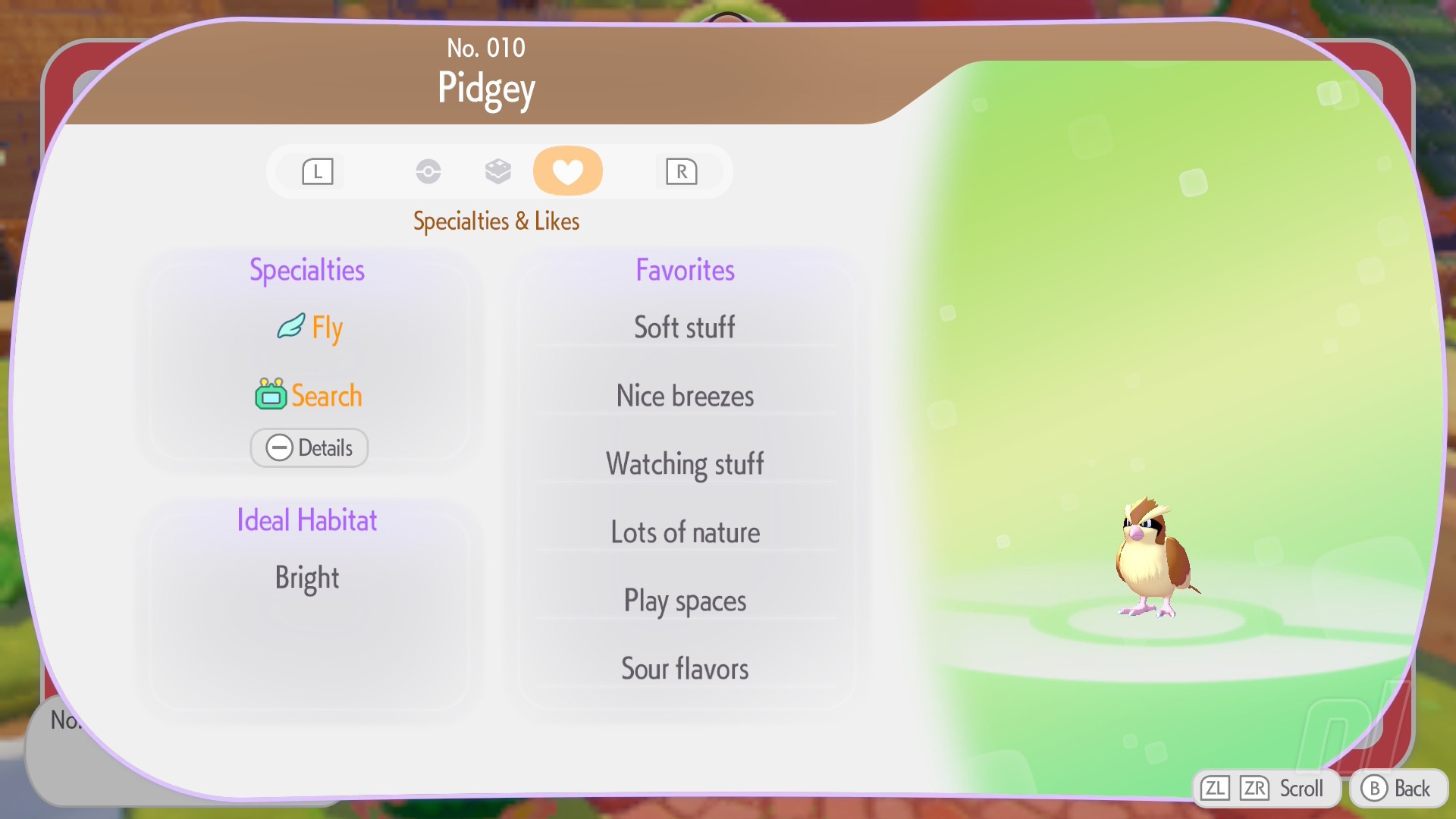 So, pull out your little device and select the Pokémon you want to check up on. Then head over to the far-right tab and you'll get a list of the Pocket Monster's likes and the type of environment they like.