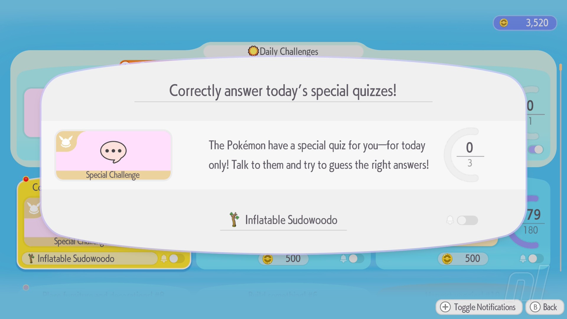 Whether you get the answer right or wrong, you'll need to repeat this process until you get three of them correct. Speak to a 'mon, give an answer, then find another 'mon with a thought bubble. You'll get a notification once you've got three answers correct.