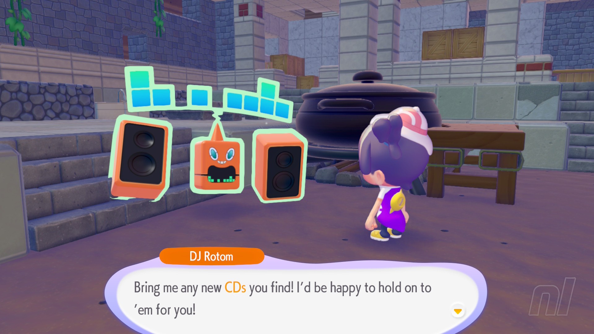 - Talk to DJ Rotom to find out that he wants a CD so he can play music. You should have some by now, but if not, you'll find these in the glowing blocks you've found throughout the game. Give it to him and he'll start playing some classic Poké tunes!