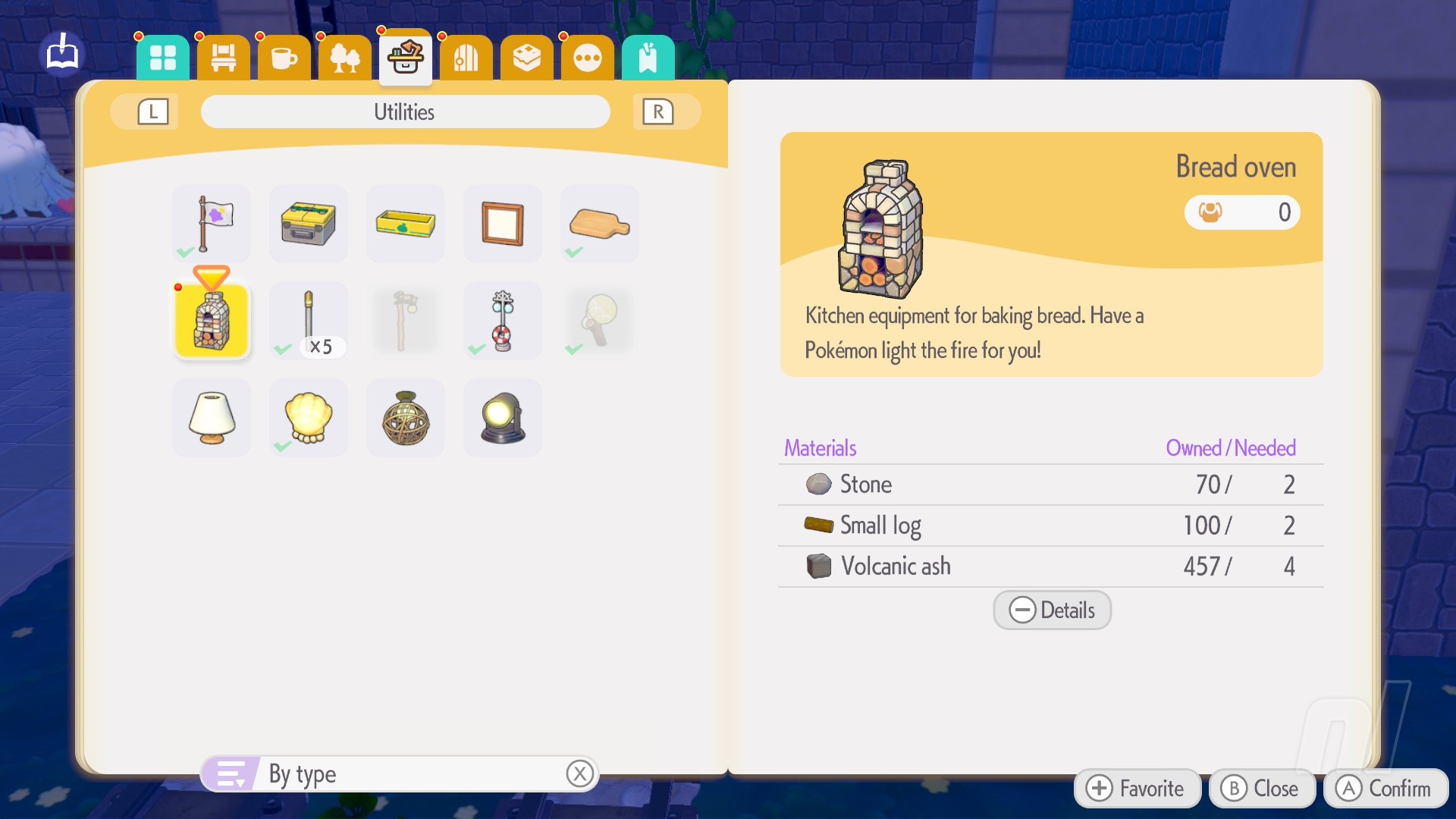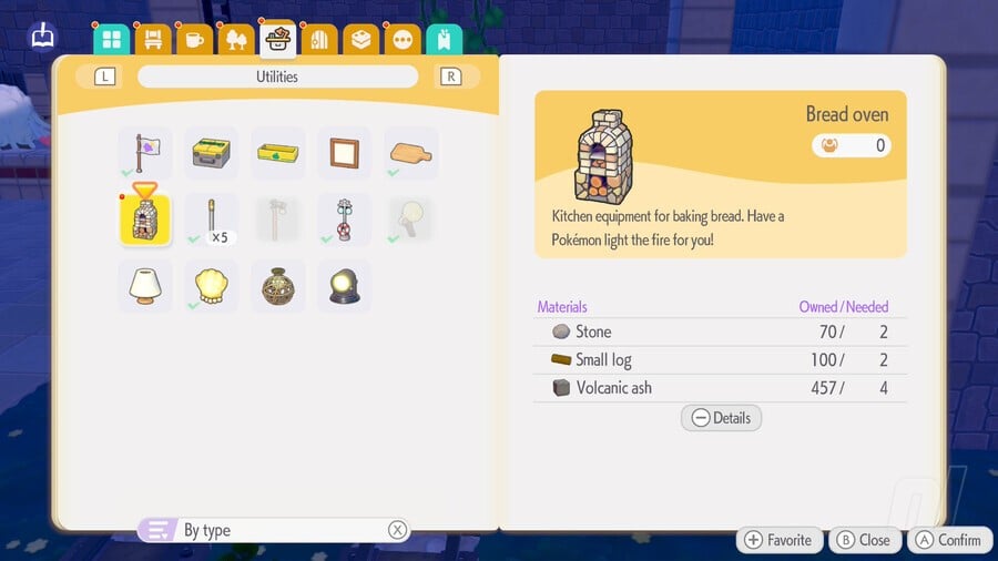 To make the Bread Oven, you'll need 4 Volcanic Ash (just break some of those black blocks close to the Pokémon Center), 2 Stones, and 2 Small Logs. You'll also need some wheat to make bread, so head back to where Dartrix lives to harvest some — and grab some beans too, for later.