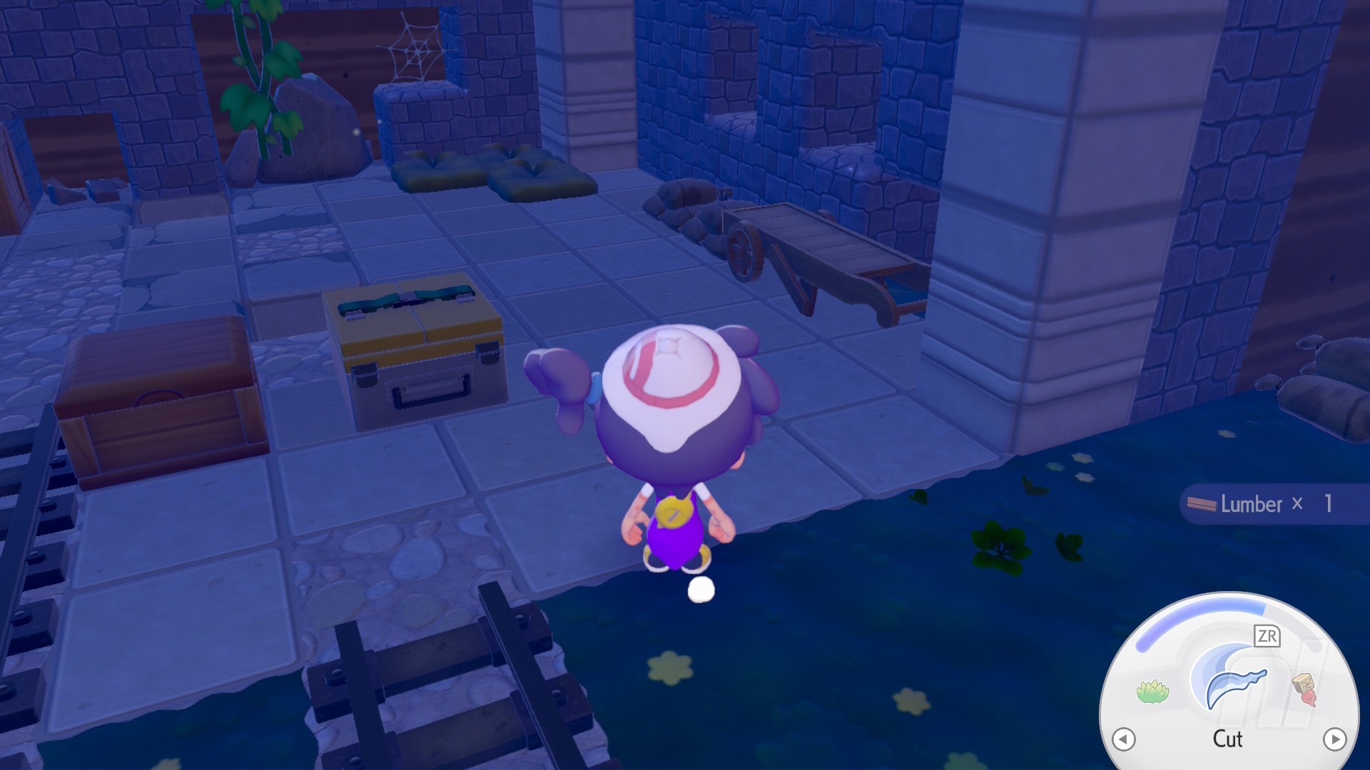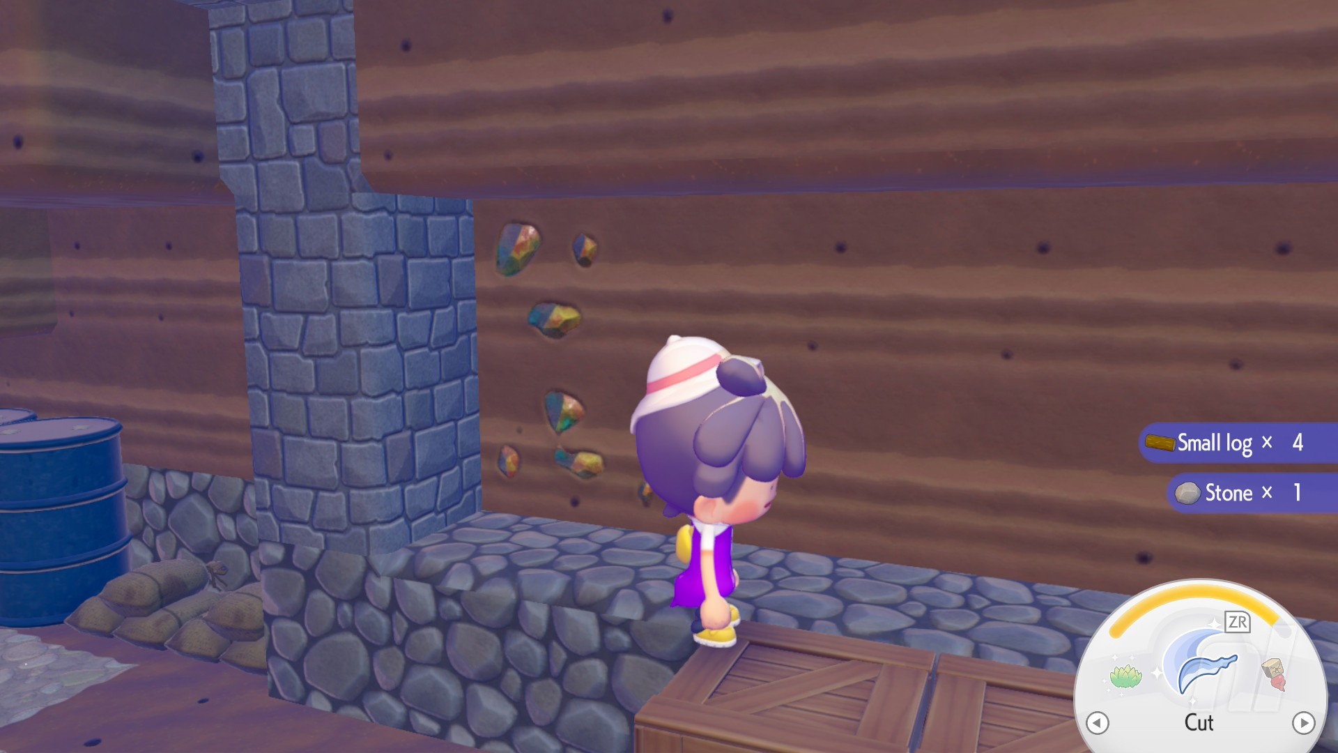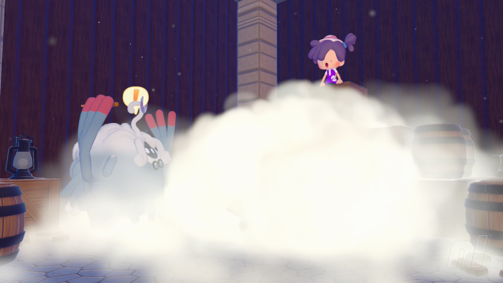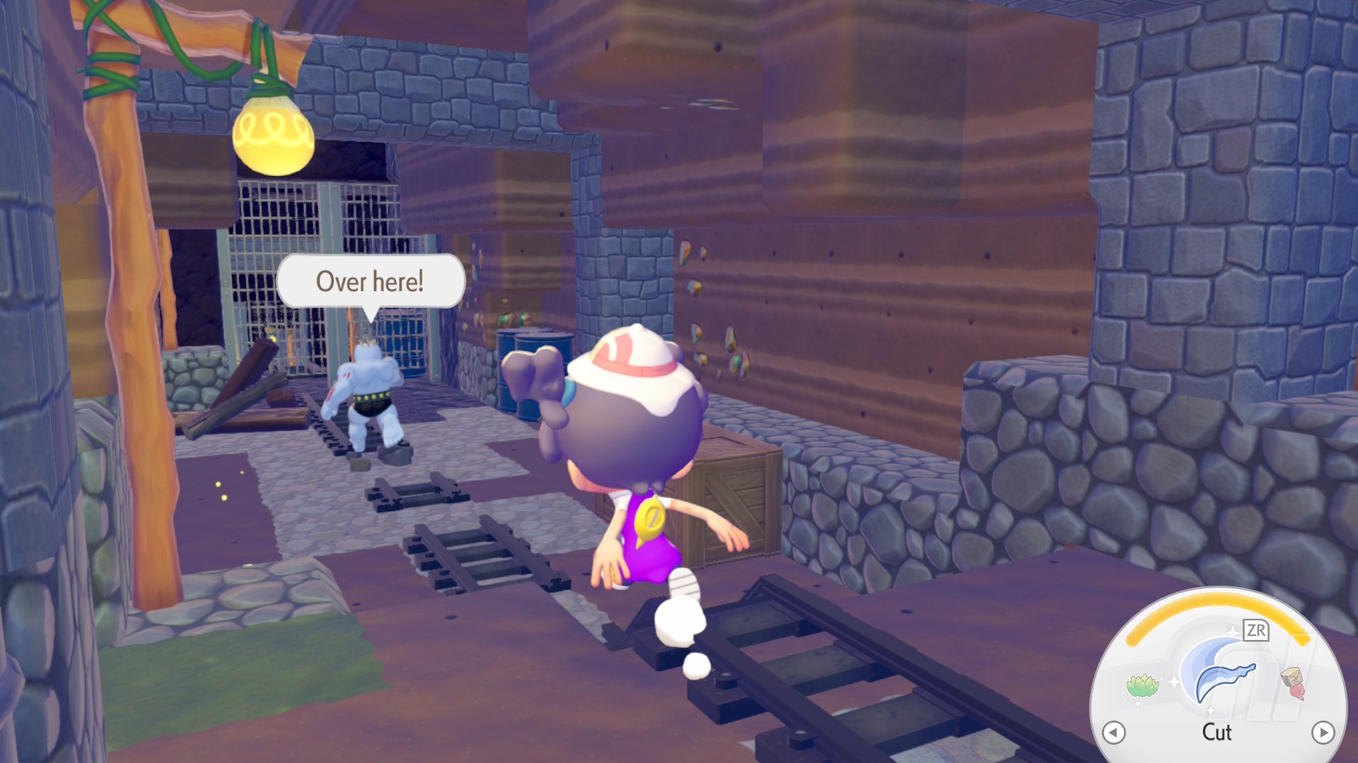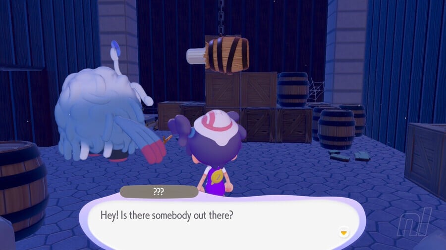 After you've fixed the PC (and built a few habitats for good measure — always a good idea to load up on Pokémon in a new area — talk to Tangrowth and follow him past the workbench to find an barrel hanging from the ceiling, crying out for help.