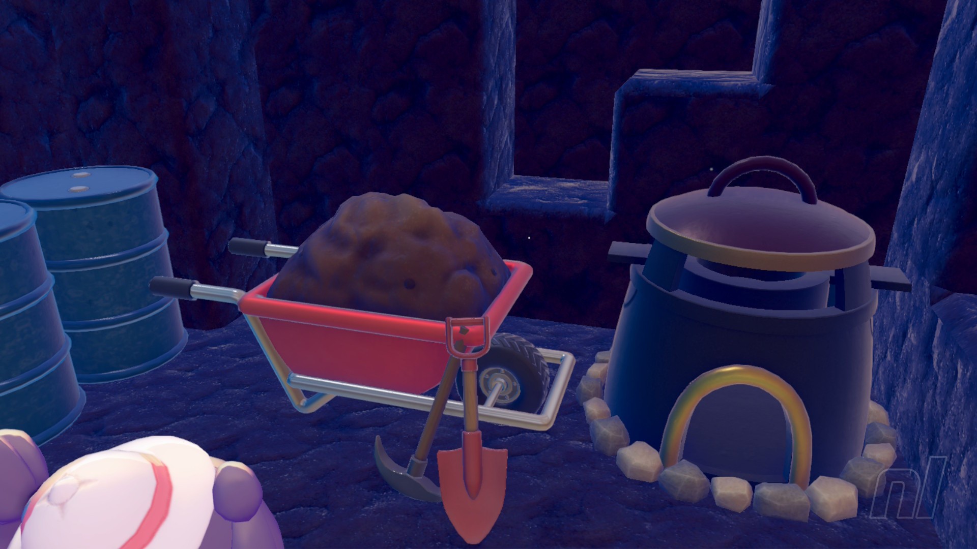 Obviously grass isn't going to save the barrel, so speak to it again and you'll get another new recipe idea and a new request. With your powered-up Leafage, you can pull moss out from cave floors. So follow the minecart tracks to a blocked wall, and break them with Rock Smash. Head inside the new cave until you reach an opening with steamy hot waters. It's a hot spring!