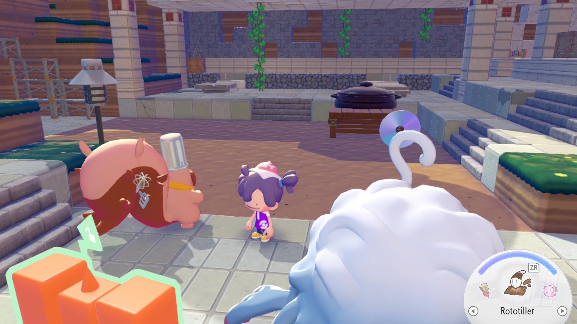 Still, Dente gives you a Party Cooking Pot to place down somewhere in the area. You'll want to clear out all the Volcanic Ash blocks here first, so use Rollout to make that super easy. Then place it down anywhere on the soil.