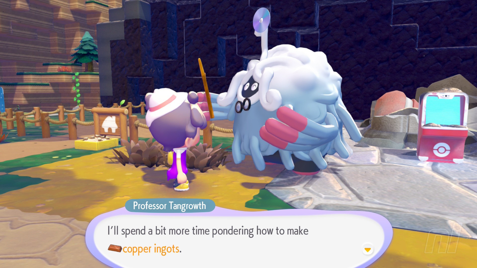 Follow Professor Tangrowth through the construction, mining materials, and ruined buildings to reach the Pokémon Center. Except there's something odd about this pile of rubble: the PC isn't connected!