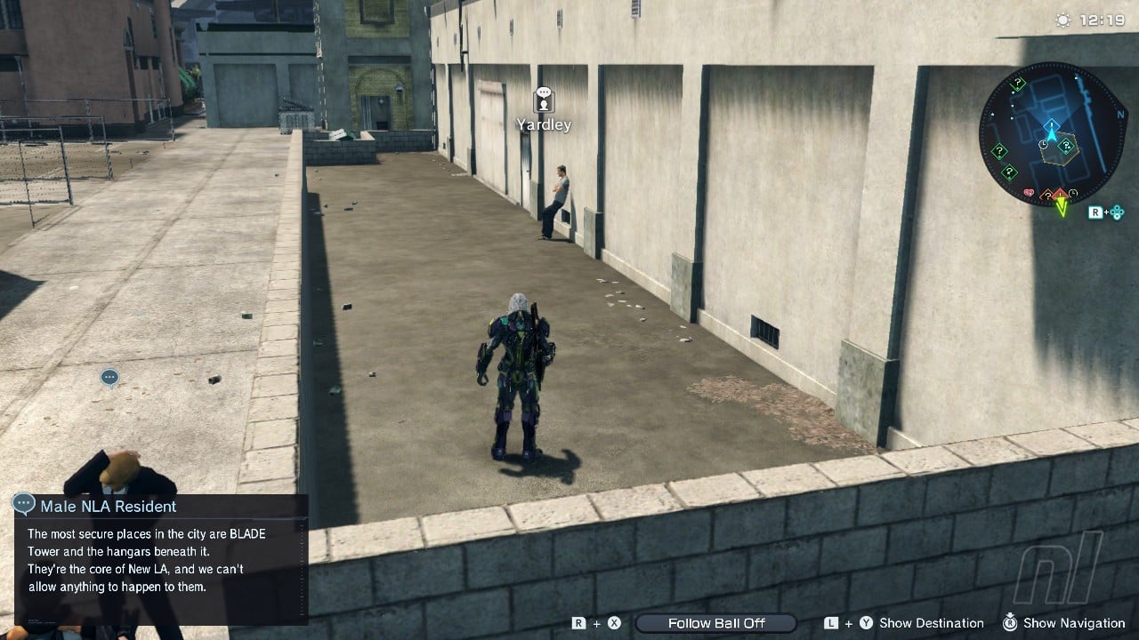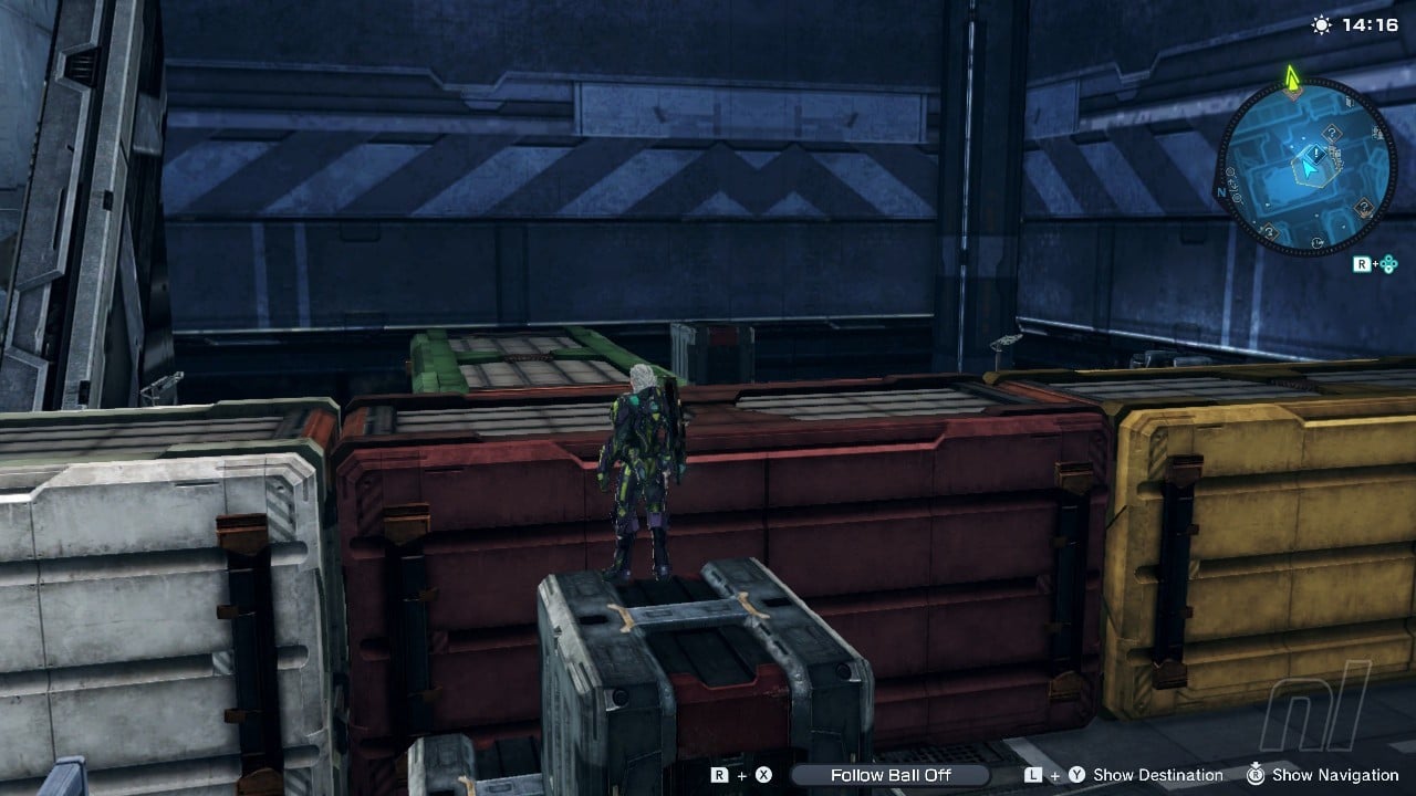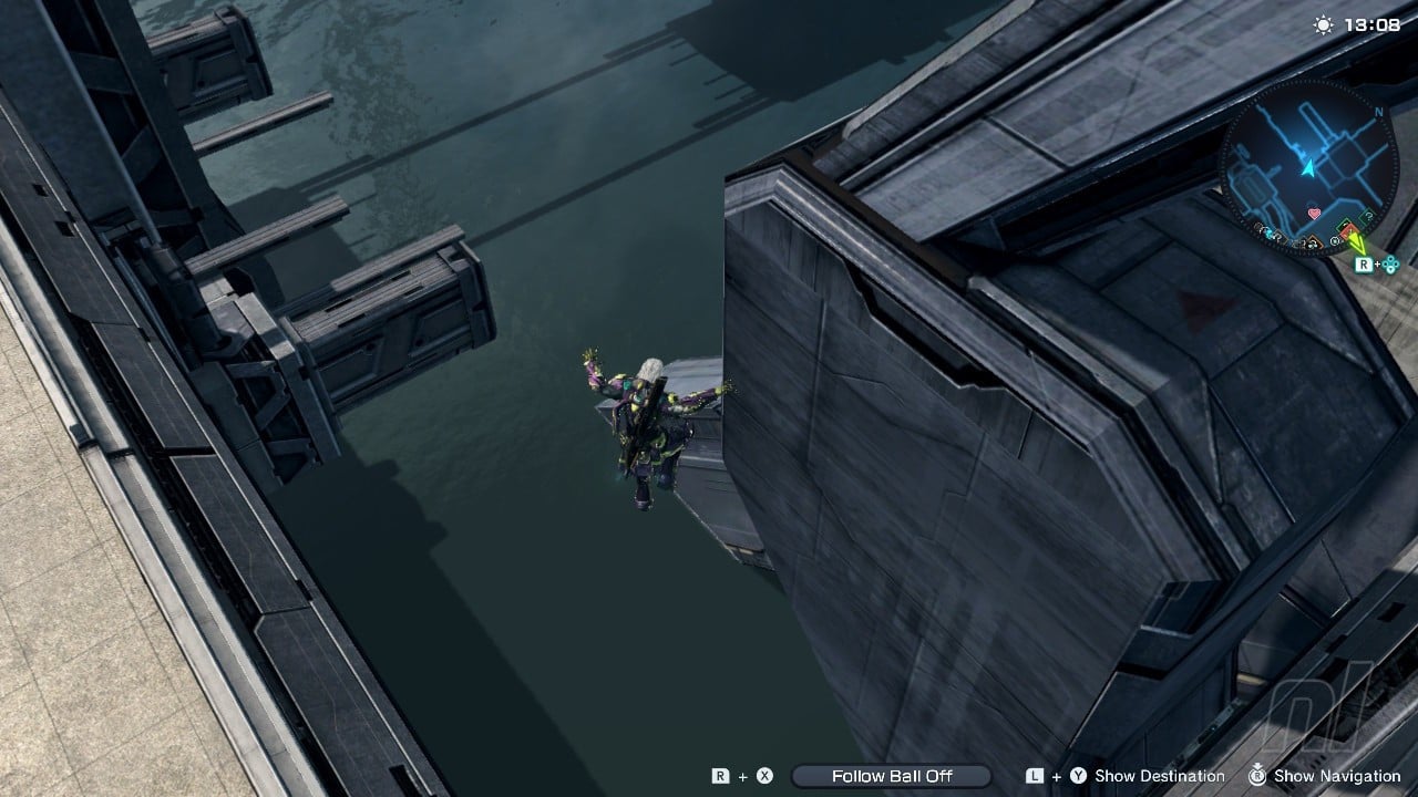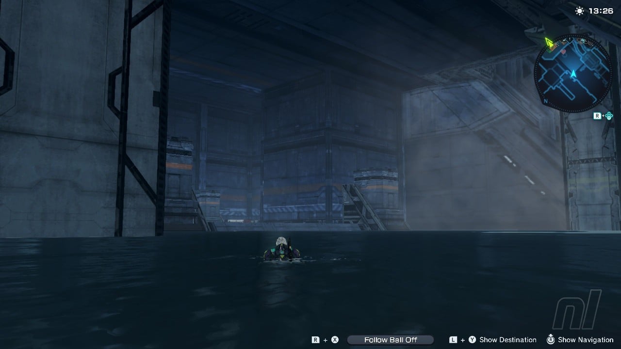 To get to the hideout, you need to get below the Admin District in NLA, so jump down over the barrier of the highway you travelled along to get to the Restricted Hangar. Jump over, as shown, to land in the water, then swim to the white crate you can see off to one side.