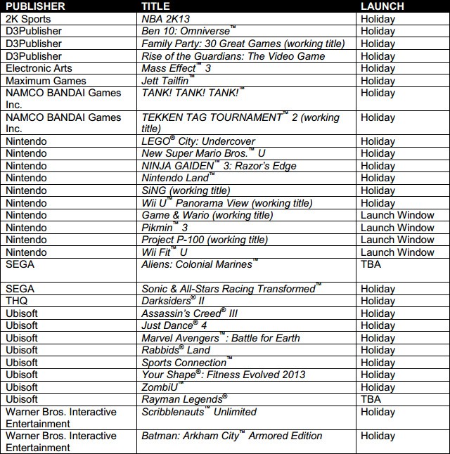 Some great games in the line-up. A new Super Mario Bros. game! Also Assassin's Creed, Mass Effect 3, Scribblenauts, Sonic All-Stars Racing Transformed, Marvel games, and Nintendo Land? (Seems interesting enough, my guess is a compilation game with a bunch of small games on it?) Sort of like The Orange Box.