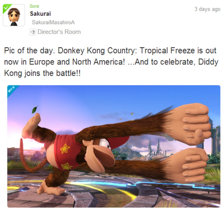 Just as it looked like last week would be light on Super Smash Bros. reveals Masahiro Sakurai hit us with confirmation that Diddy Kong will be a playable character once again, keeping up the momentum and hype for the 2014 dual release.