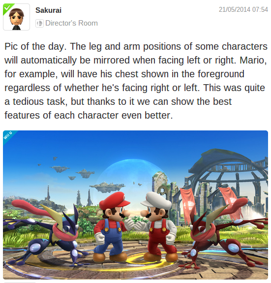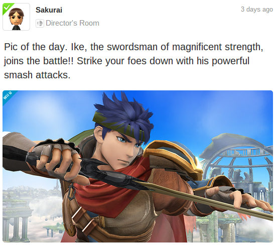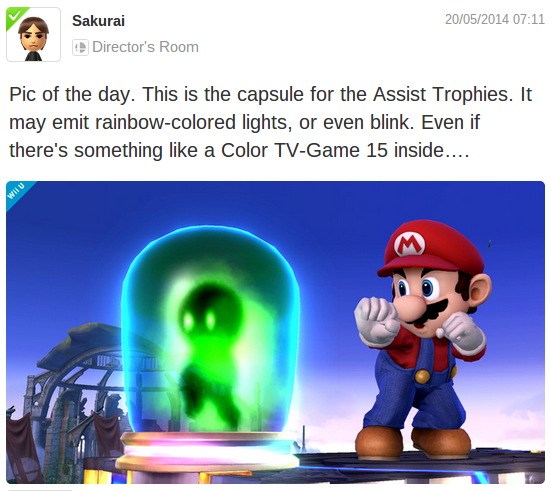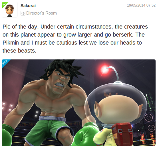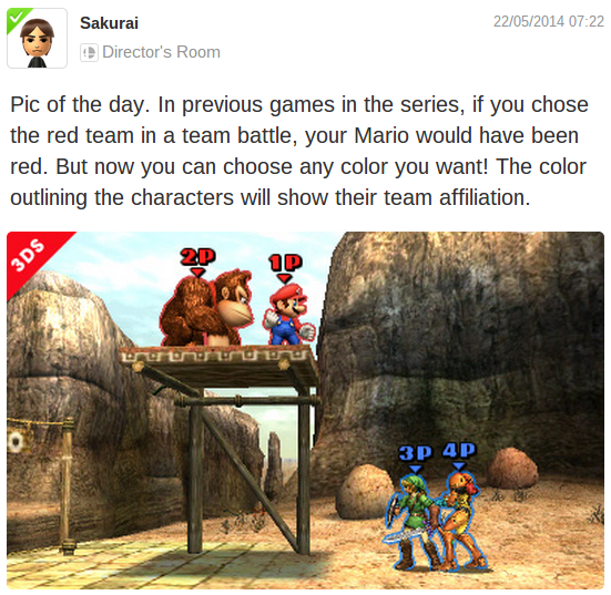 Beyond that excitement Masahiro Sakurai has been doing his thing on the Director's Room Miiverse community , throwing in extra images and even — gasp — a 3DS screen.