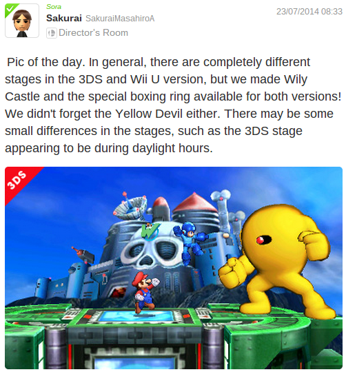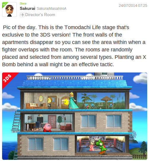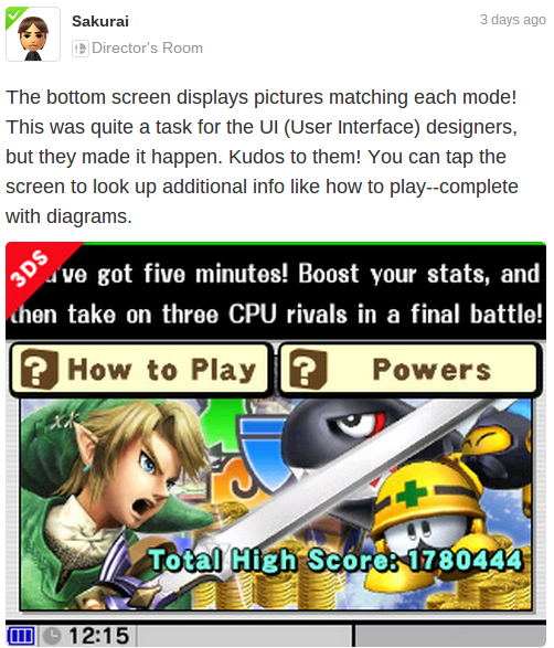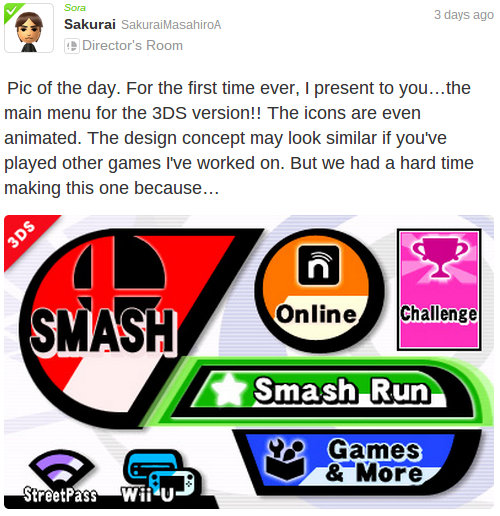 On the screenshot front, Masahiro Sakurai continued his fine form on the Director's Room Miiverse community. There were some interesting details, covering stages for popular franchises and games, along with an early look at the opening screen menu on the 3DS, Wii U button included.
